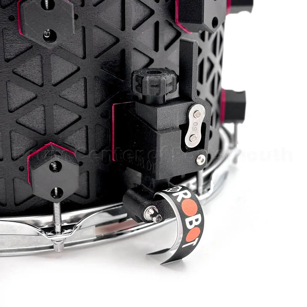 - Machined Vents: The Robot logo is machined directly through the shell, acting as vents that allow the drum heads to breathe freely, which enhances the drum's response and projection.