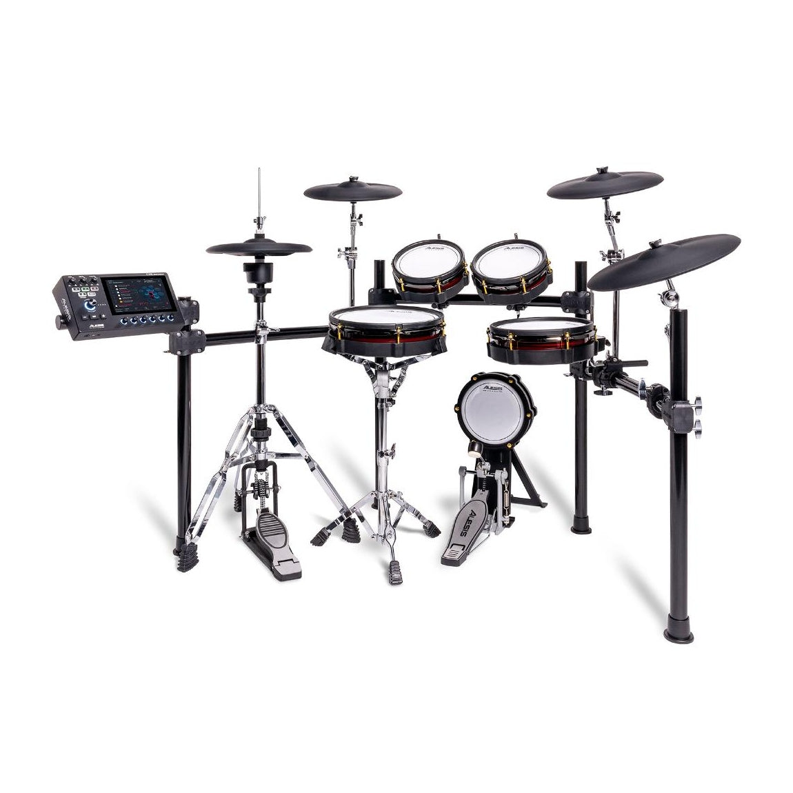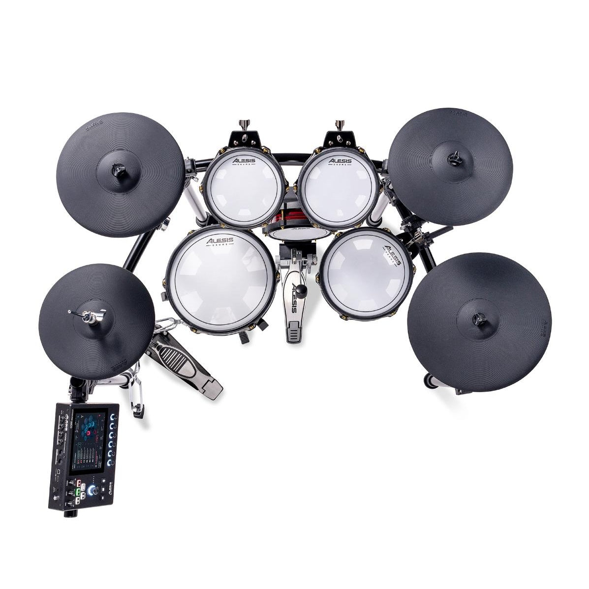 A dual-zone snare drum with independent sounds triggered on the head, rim click, and rim shot, followed by 8”/8”/10” toms and an 8” kick drum provides ample playing surface, suitable for all varieties of single and double kick drum pedals. The tension can be adjusted on all mesh heads, letting you set the exact level of rebound and expressiveness to your preference. Unnatural and unwanted ‘hotspots’ on the heads are eliminated with Alesis's unique patented anti-hotspot sensor design (U.S. Patent 9,424,827)