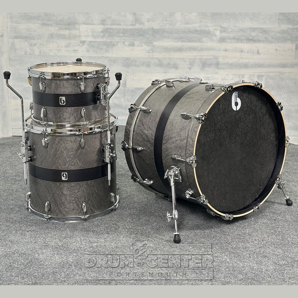Easily one of the classiest finishes we've ever seen, this thumpy 3-piece features a HIGHLY figured Silver-grey Birds-eye Maple outer veneer with a Black Ash central stripe, and is accented with hand cut matching pinstripes. 22x16 bass drum w/NO mount, 13x9 tom w/Palladium bracket, 16x16 floor tom w/legs. Clamp-on mount included. Drums only; hardware/cymbals sold separately.