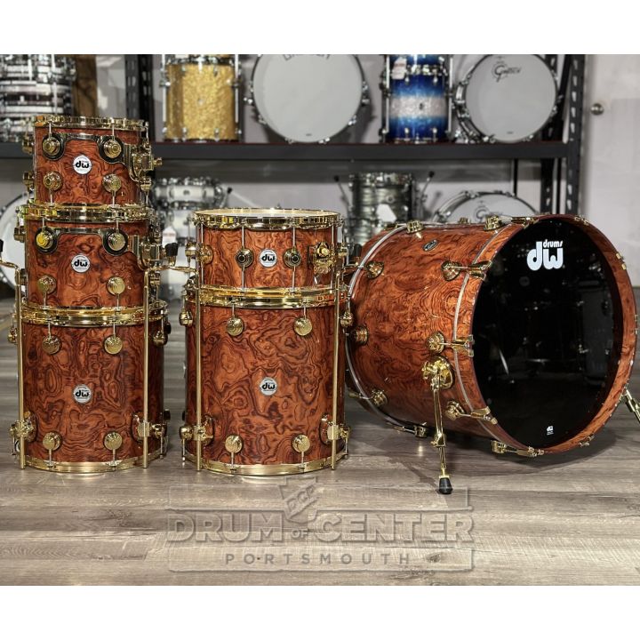 22x18, 10x8, 12x9, 14x14, 16x16, 14x6.5. Waterfall Bubinga with gold hardware! Drums only; hardware/cymbals sold separately.