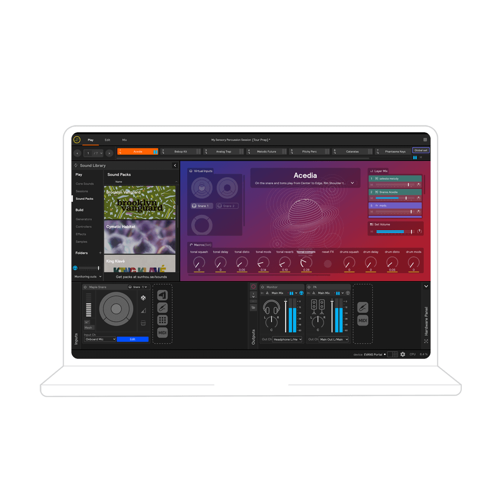 This system unlocks extensive sonic control using the Sunhouse™ Sensory Percussion 2 software, making it ideal for practice, performance, or production. Drummers gain access to: