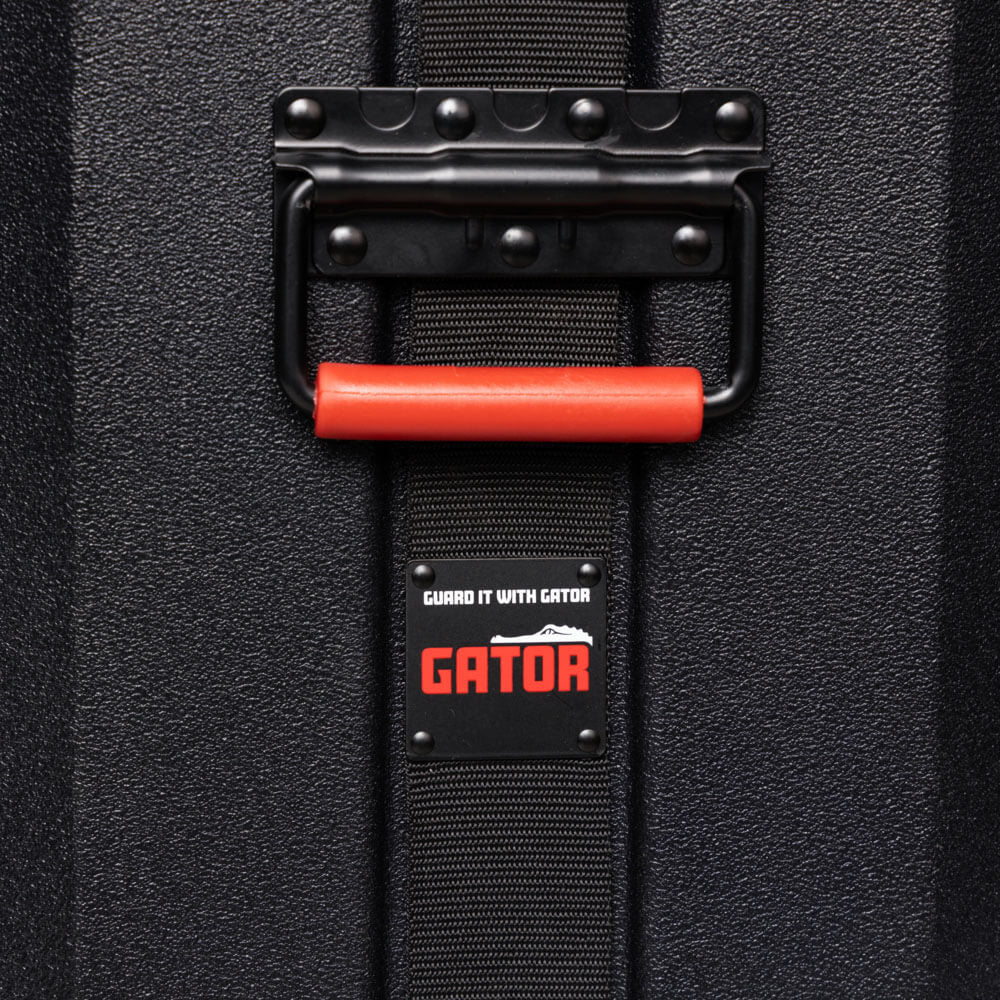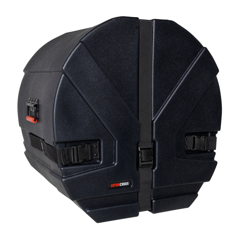 This Gator Grooves 22"x16" bass drum case features an extremely durable roto-molded construction with a padded micro-velvet interior for maximum protection. The lining is wrapped over the lip of the case and utilizes a double-stitch technique where the lining is stitched through the interior and exterior of the case, preventing any potential separation after years of use. The Gator Grooves design channels interlock with the pedestal feet for unmatched stability and convenience when storing or transporting your drums. Gator's exclusive rear-aligned stacking hugs the wall when stacked but also provides balanced stability when using a hand truck or dolly to move your kit. In addition, each Gator Grooves bass drum case features dual side carry handles for a secure, two-handed ergonomic grip. You'll also enjoy some extra peace of mind knowing your bass drum is secured in the case with three heavy-duty 2-inch straps and locking high-tension buckles.