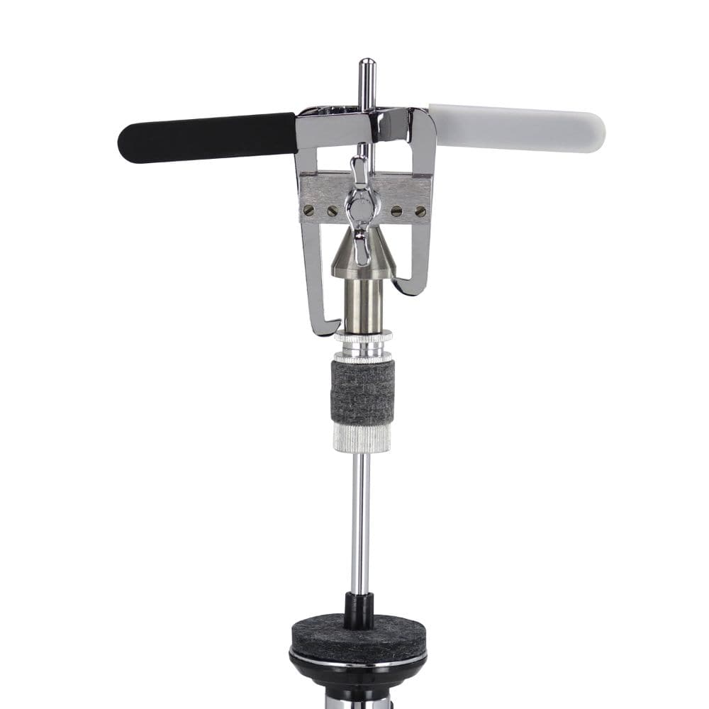The Double Drop Clutch gives double bass players three different hi hat sounds that normal drop clutches are not able to do. There are two color coded levers that allow the player to achieve two different open settings; the partially open sizzle sound, as well as the wide open sound with the foot engaged in normal hi hat operation. Once the clutch is completely disengaged, the hi hat drops and gives off a closed sloshy sound when played. This clutch gives players an additional hi hat sound they are not able to get without using an X hat while playing double bass.