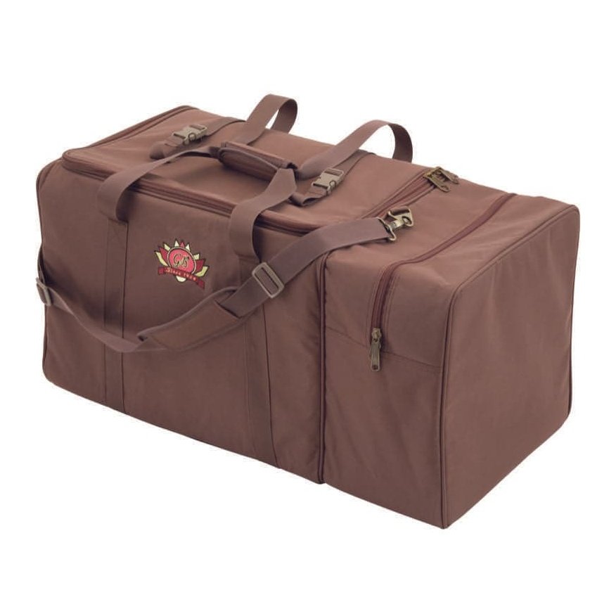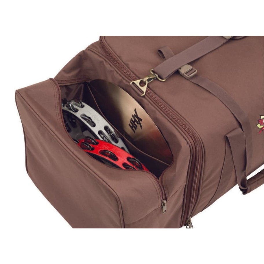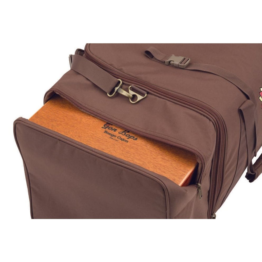 The Gon Bops Cajon/Percussion Duffel Bag offers players a great solution for transporting a cajon along with a selection of hand percussion, cymbal and stand. It is the perfect bag for percussionists or drummers who perform with a set-up based around a cajon or cajon kit. The bag includes a cajon compartment, a cymbal sleeve, a roomy percussion pocket that also fits a small snare, and straps on the top to securely attach a cymbal or hi-hat stand, providing a single solution for transporting all their gear. Constructed from fully-padded, water-resistant fabric with silk-lined interior, the new bag offers excellent protection for valuable instruments. Designed in Gon Bops brown with an embroidered vintage logo, this is a quality bag at every step.