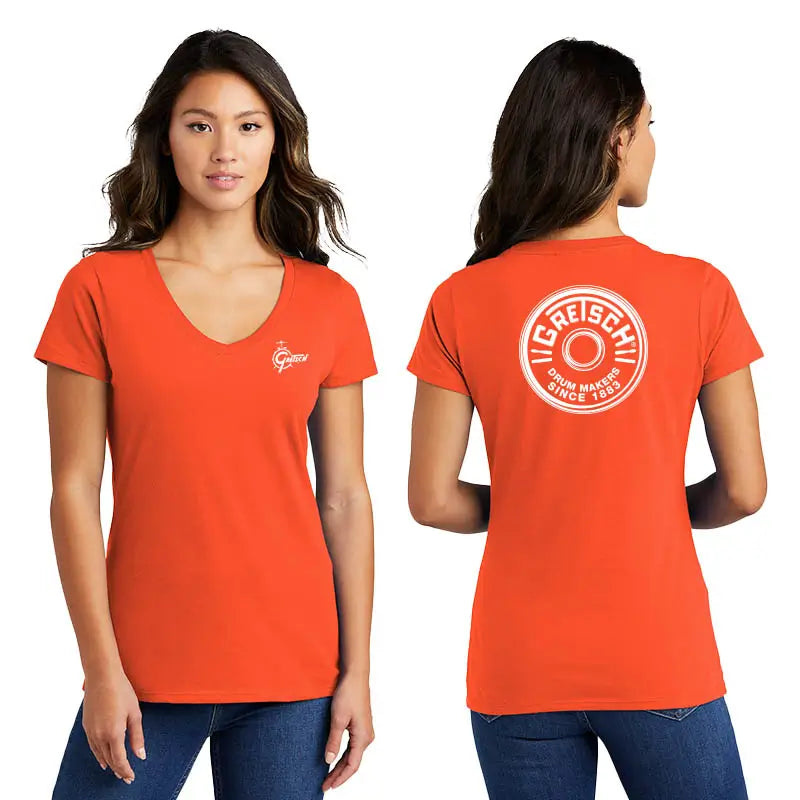 This stylish and comfortable orange tee has a v-neck and is fashion fit for ladies. It features the legendary Gretsch Round Badge on the back and the iconic Gretsch Drum Set logo on the front.