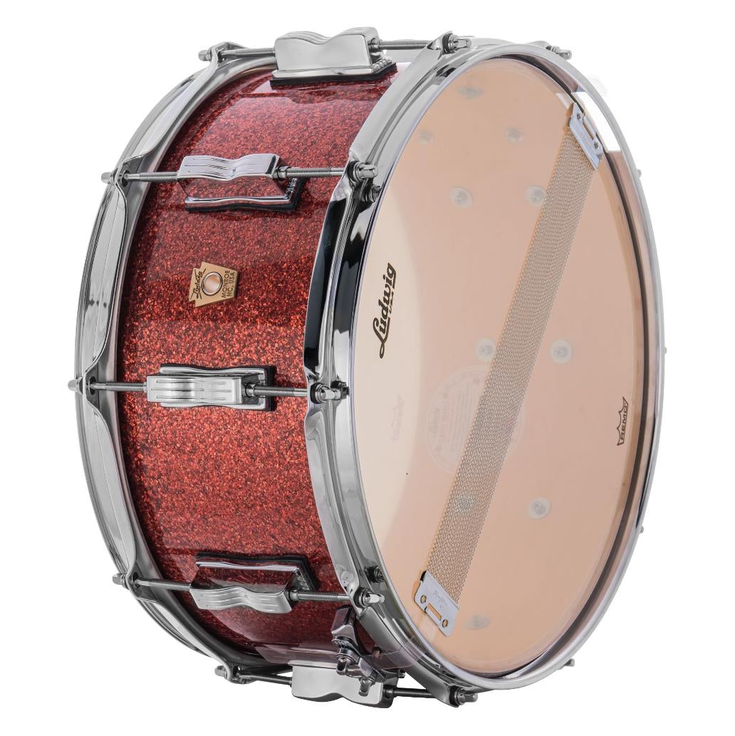 This Ludwig snare drum features a P88 throw-off, P35 snare butt, Classic small twin lugs, triple-flange hoops, 20-strand snare wires, medium coated Ludwig batter head.
