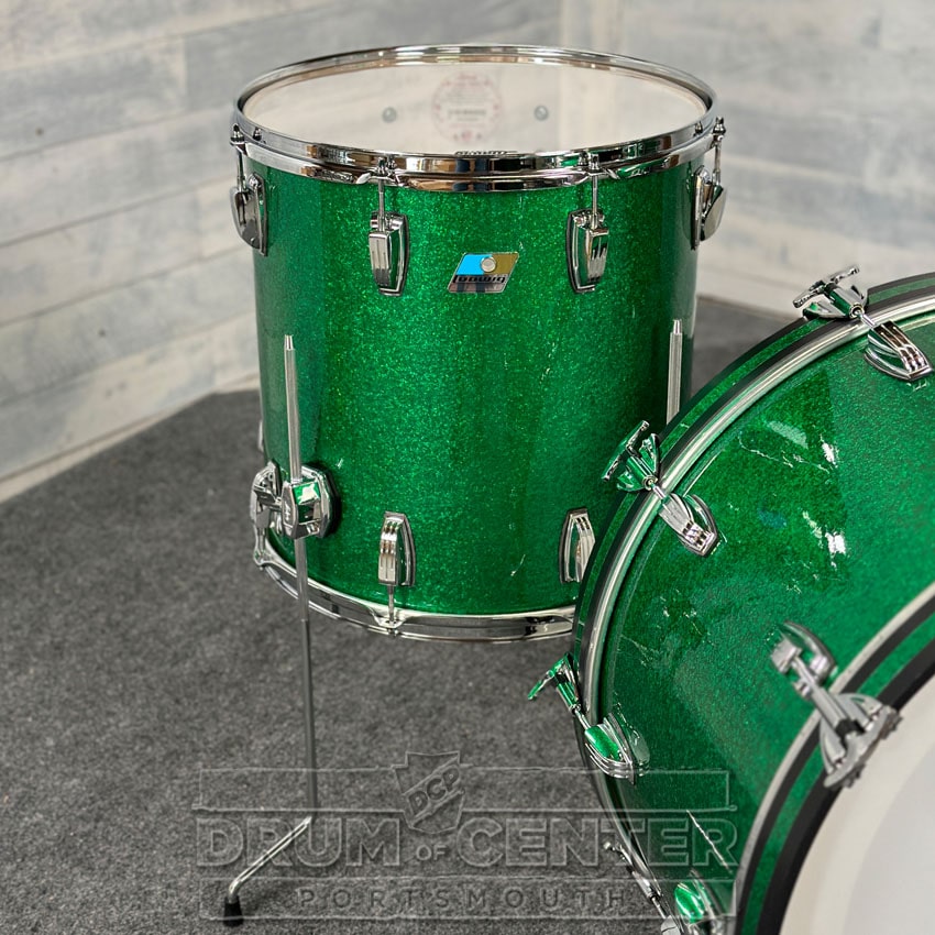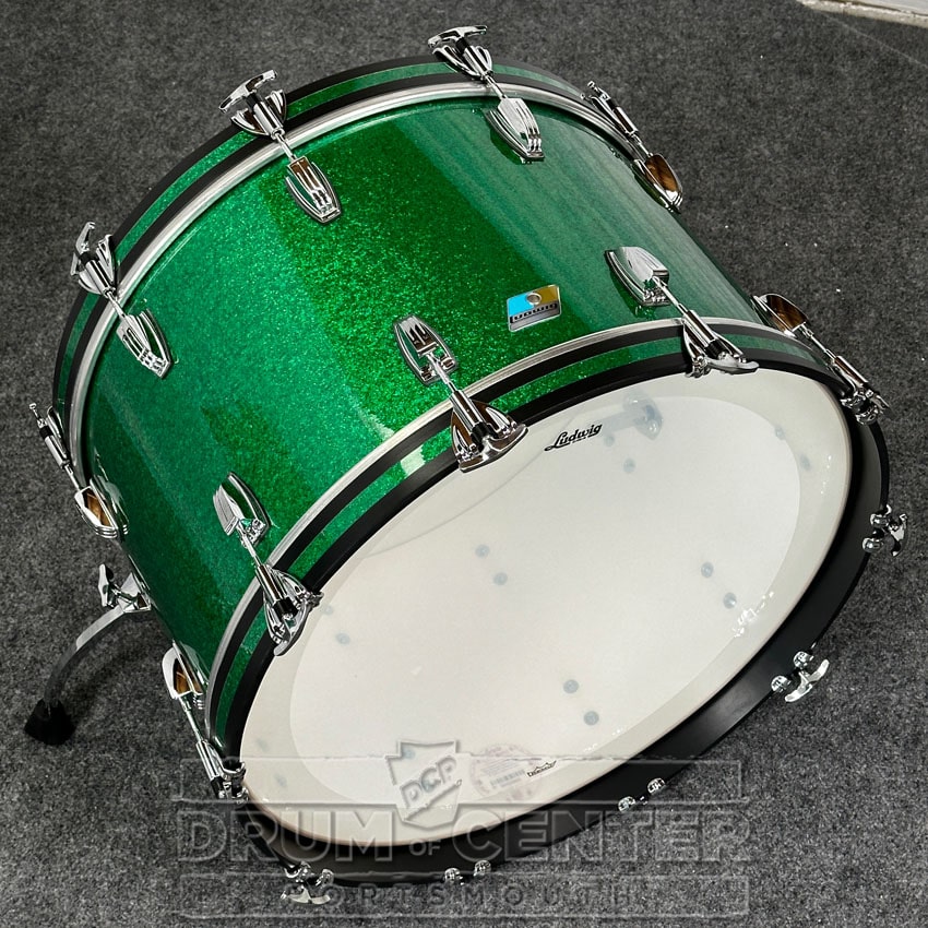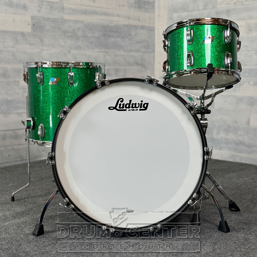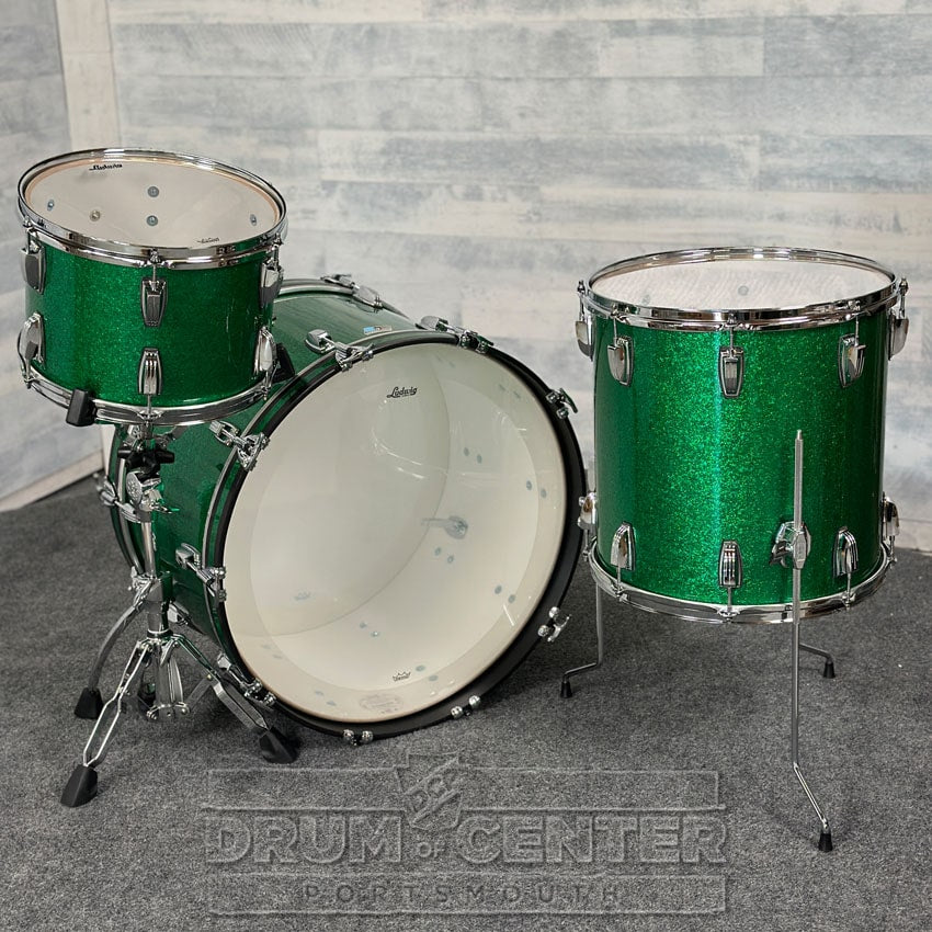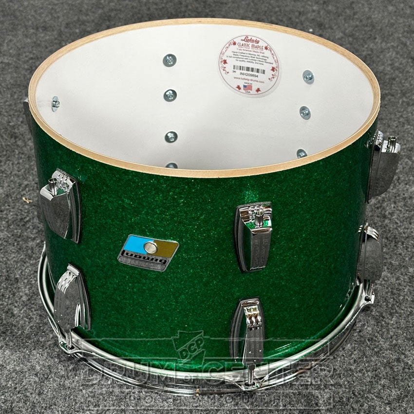 This Classic Maple drum set from Ludwig features 7-ply 100% maple shells with white "Reso-Coat" interiors, finished in a Green Sparkle wrap. The sizes of this specially configured pack are 24x14, 13x9, and 16x16.