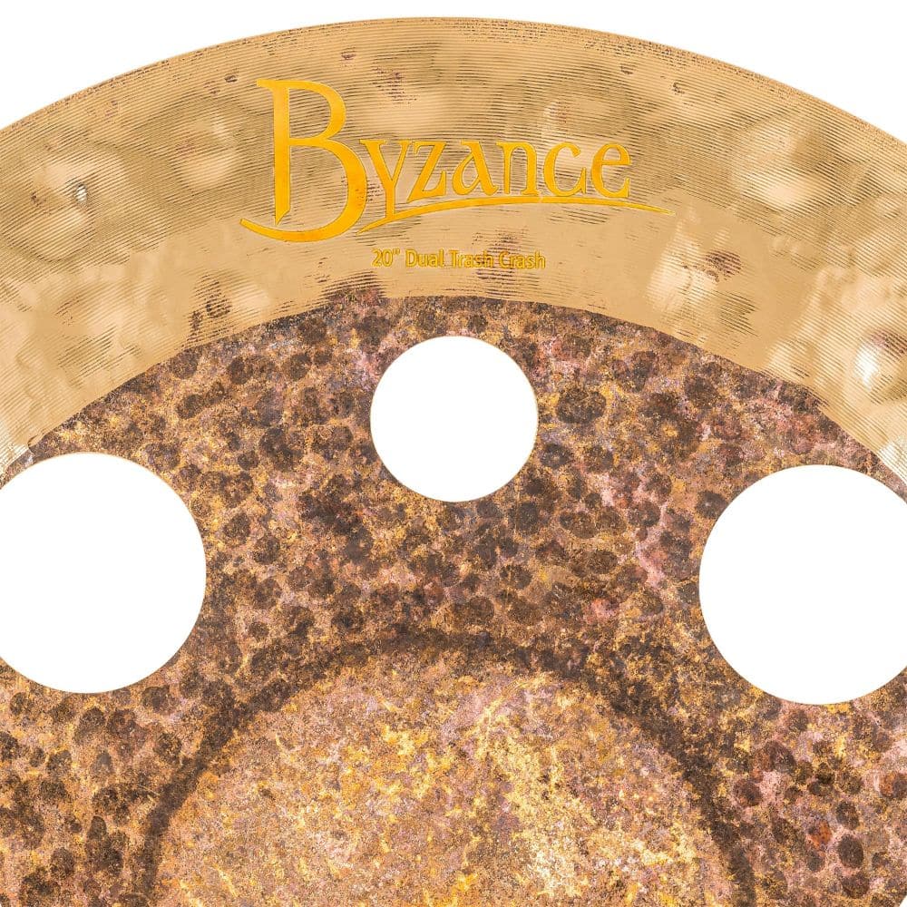 Their hand hammered and lathed surfaces with warm sounds and selection of models may be rooted in tradition, but Meinl Byzance cymbals are the ultimate choice when it comes to modern versatility. Every Byzance model is hand hammered into shape by cymbal artisans in Turkey, giving each cymbal its own unique and colorful voice. The overall presence that Meinl Byzance delivers is dark, buttery warmth that flows around crisp definition. The Byzance 20 Dual Trash Crash is a stunning contrast of extra dry and brilliant finish with a unique combination of hammering and lathing. This cymbal is versatile and dynamic with a full-bodied sound that has applications in practically any musical setting.