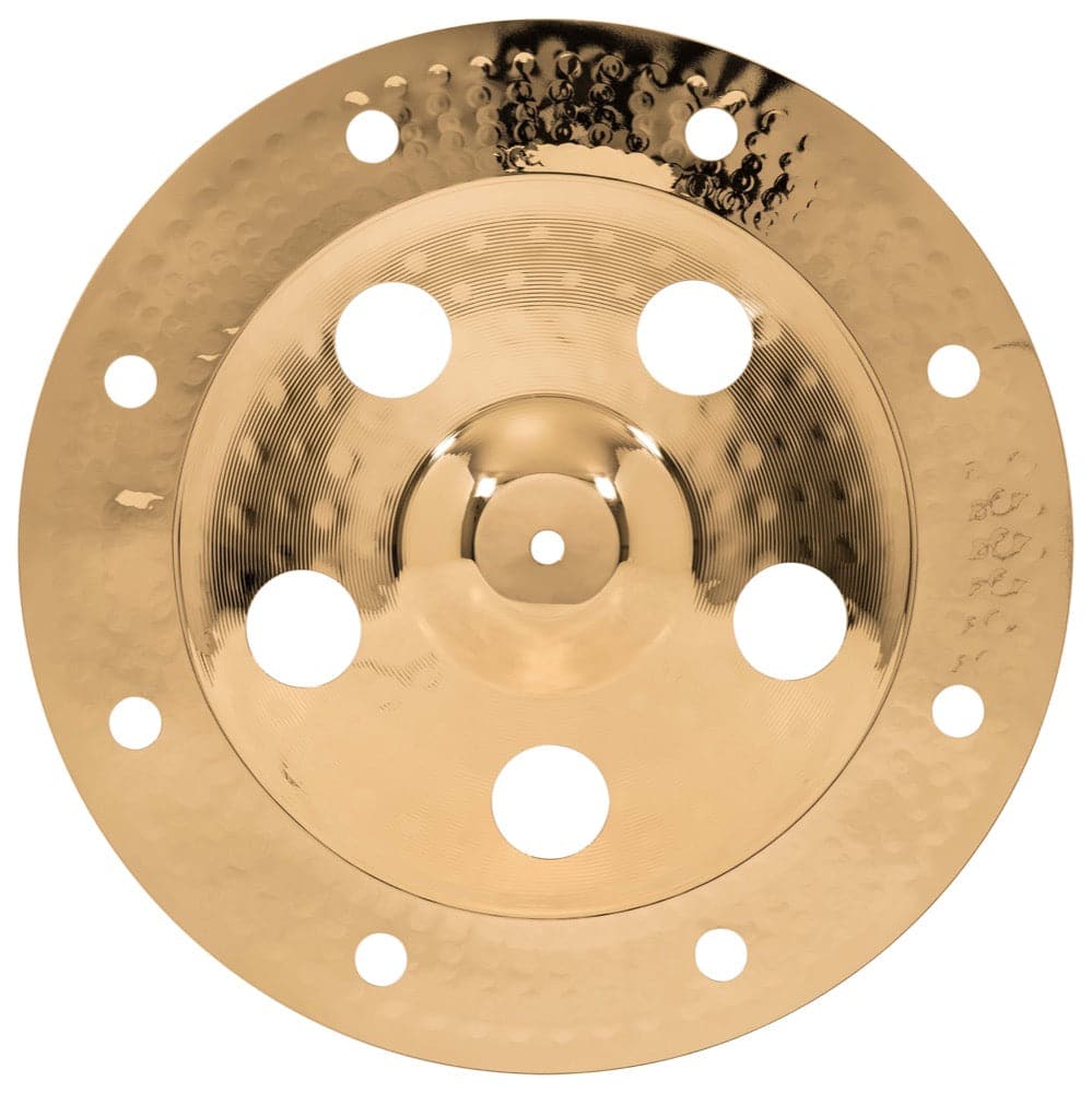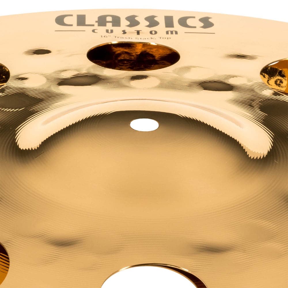 Classics Custom 16" Trash China (bottom cymbal). With both cymbals positioned right side up (china not inverted), the stack gives you a bright cutting trash sound with a short lived sustain. The larger size of the two cymbals makes this stack ideal for crash riding effects. Specially cut holes in each cymbal dry out the sound and eliminate any overtones or rattling. The configuration was imagined and tested by Meinl Cymbal R&D, the goal being to produce a pre-packaged stack that is both sonically and physically great fun to play. This larger stack feels great on the shoulder of the stick. The Classics Custom 16" Trash Crash and 16" Trash China are top sellers within the Meinl cymbal family. They are superb cymbals to play on their own as well.
