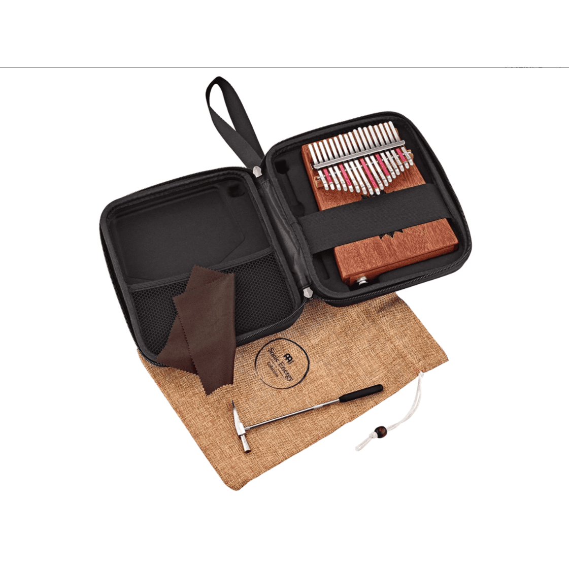 This kalimba comes with a protective case that's great for traveling. Also included is a tuning hammer to make adjustments as needed (the kalimba comes pre-tuned). Finally, it also comes with a microfiber cloth for cleaning and a linen storage bag.