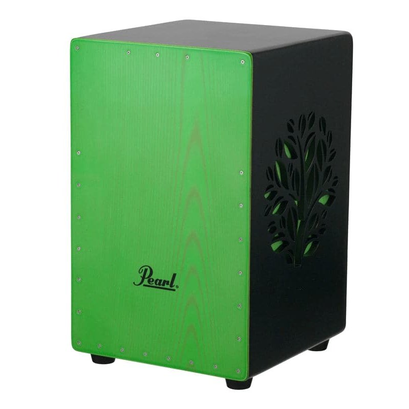 Pearl 3D all wood box cajon with CNC cut tree design on both sides. Asiatic wood construction with with fixed snares and an enlarged bass striking area that allows the player to sit straighter. Black lacquer body with a lime green faceplate and 3D design.