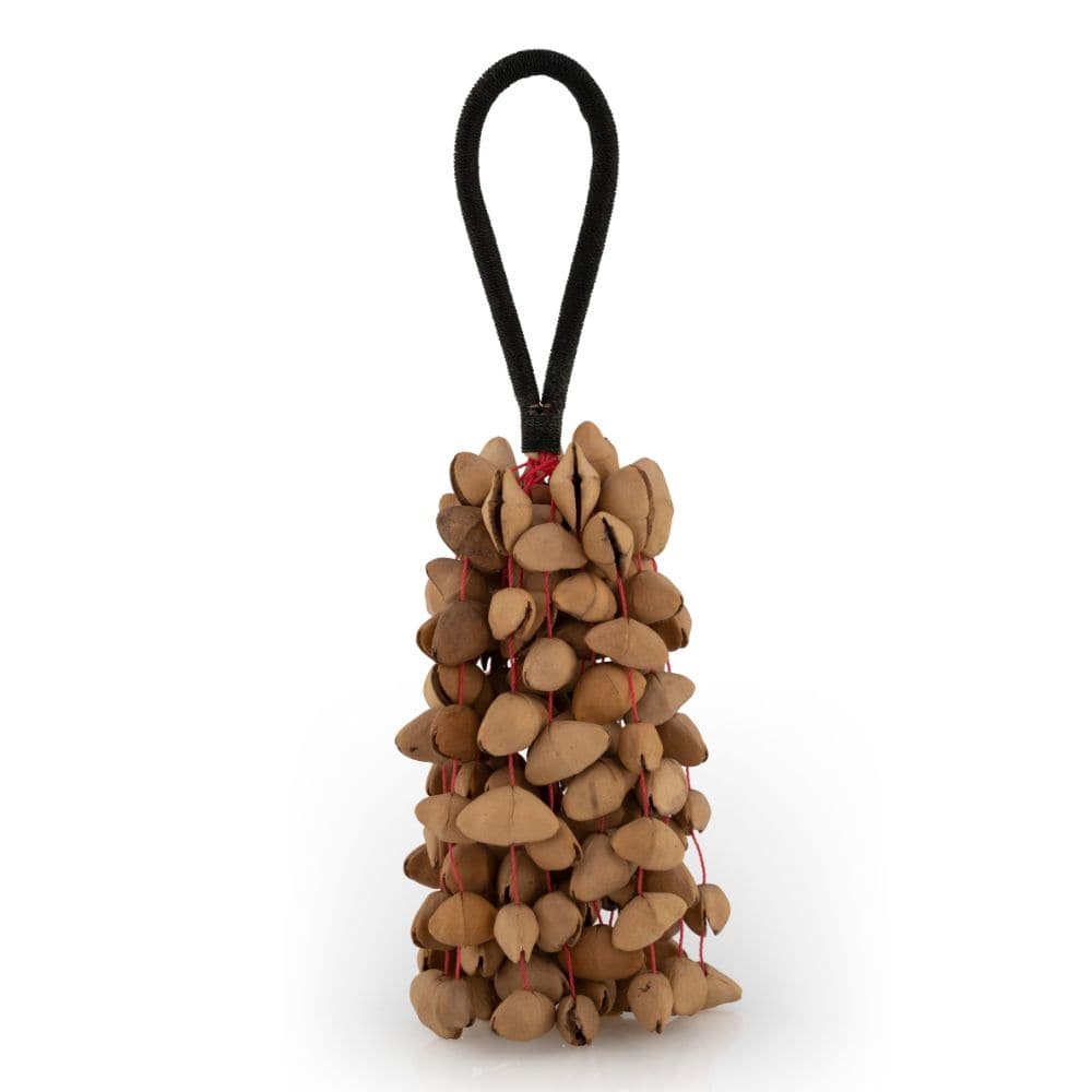 Pearls Kenari Nut hand shaker creates a robust woody tone that will add texture to a variety of musical styles. The shaker features a 5 looped handle connected to 22 strands of Kenari nuts. Each strand holds 6 hand tied nuts on nylon cordage. The Kenari nuts hard exterior and hollow, triangular shells become miniature sound chambers when played.