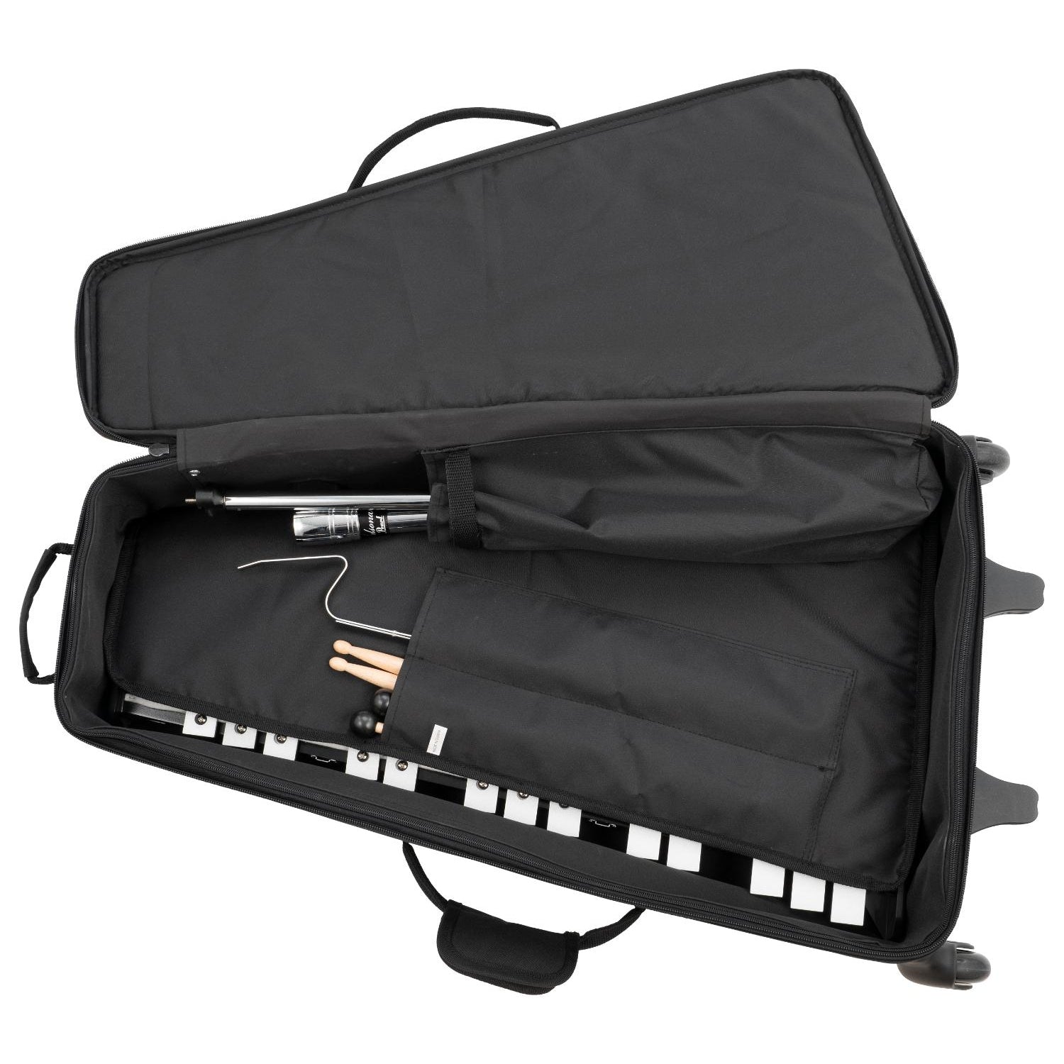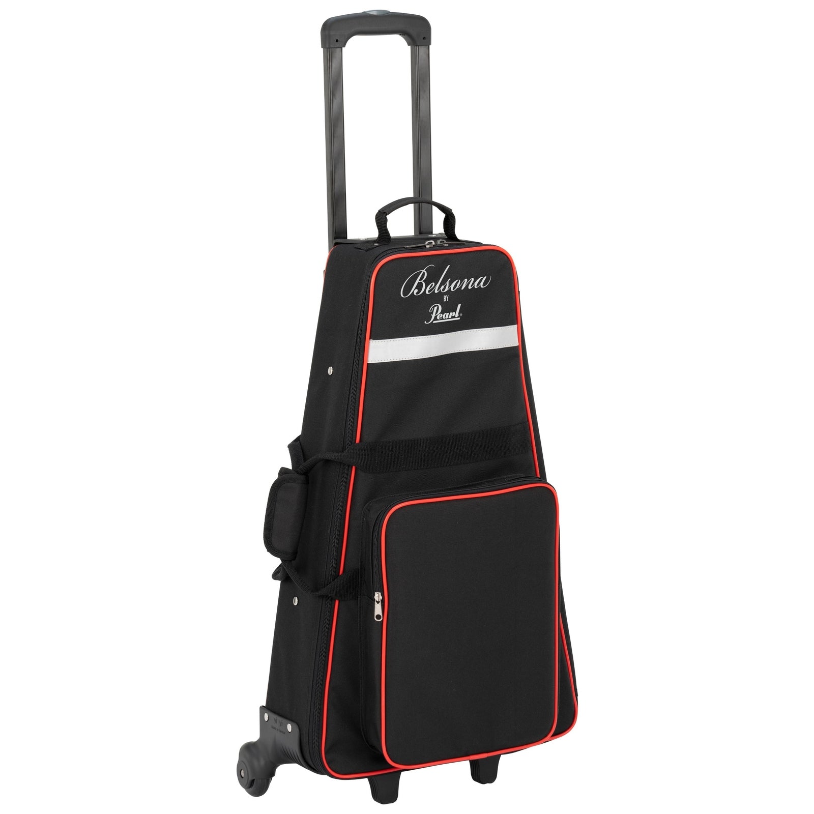 - Nylon style carrying case with reflective stripe and built-in wide-set roller blade wheels, and heavy-duty multi-stop height adjustable retractable handle.