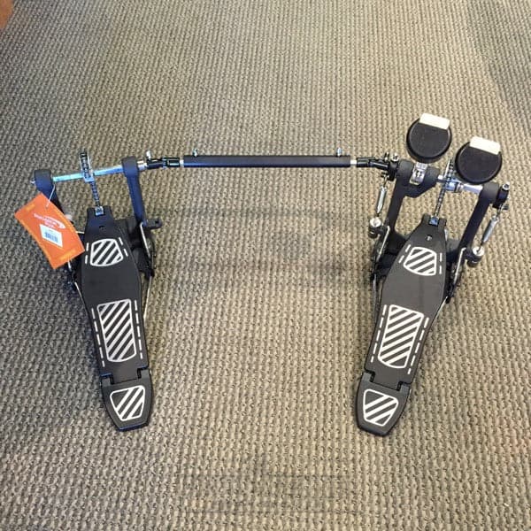 Durable and affordable double bass pedal. Fast and smooth chain drive system. Adjustable dual surface beater with felt or hard beater surface. Adjustable spring tension. Easily attaches to bass drum hoops. Includes pedal bag.