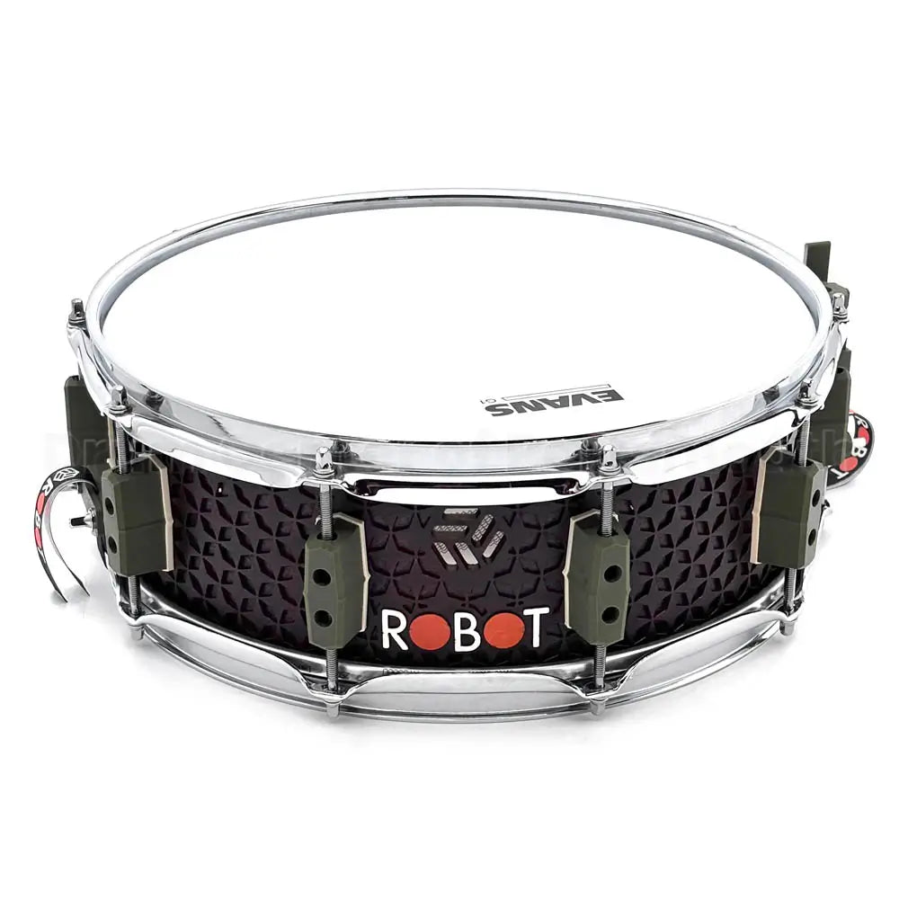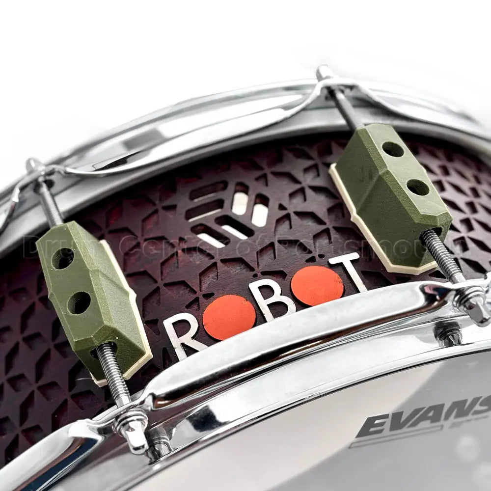 - Machined Vents: The Robot logo is machined directly through the shell, acting as vents that allow the drum heads to breathe freely, which enhances the drum's response and projection.