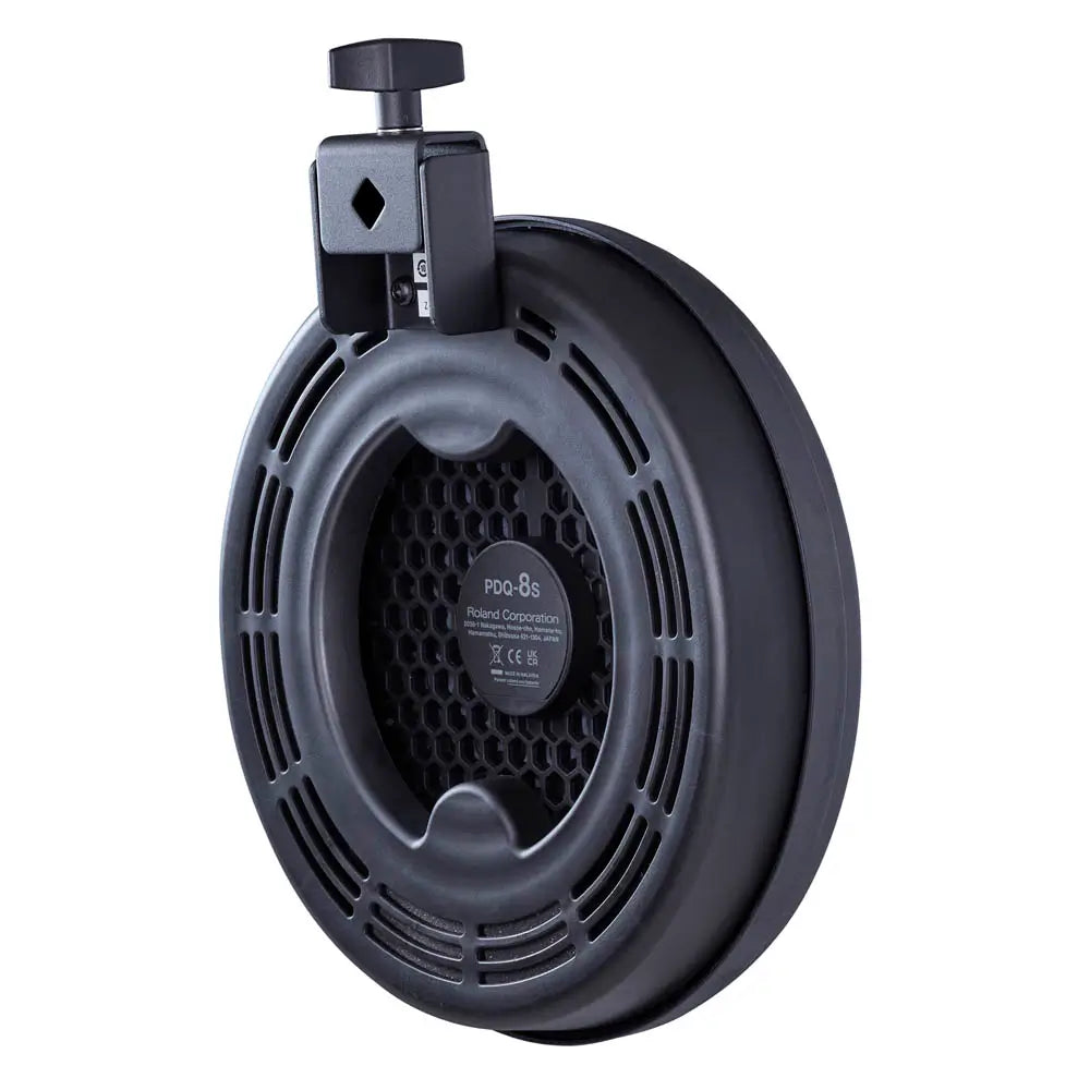 The PDQ-8S snare pad incorporates a noise-absorbing honeycomb rubber insert beneath a mesh head. Precision-engineered vents on the underside of the playing surface help dissipate air pressure, further minimizing noise. Additionally, the soft rubber rim covering ensures that rimshots are also quiet. Despite these advanced noise-reducing features, playability remains exceptional, offering the excellent stick feel and natural rebound expected from a top-tier V-Drums pad.