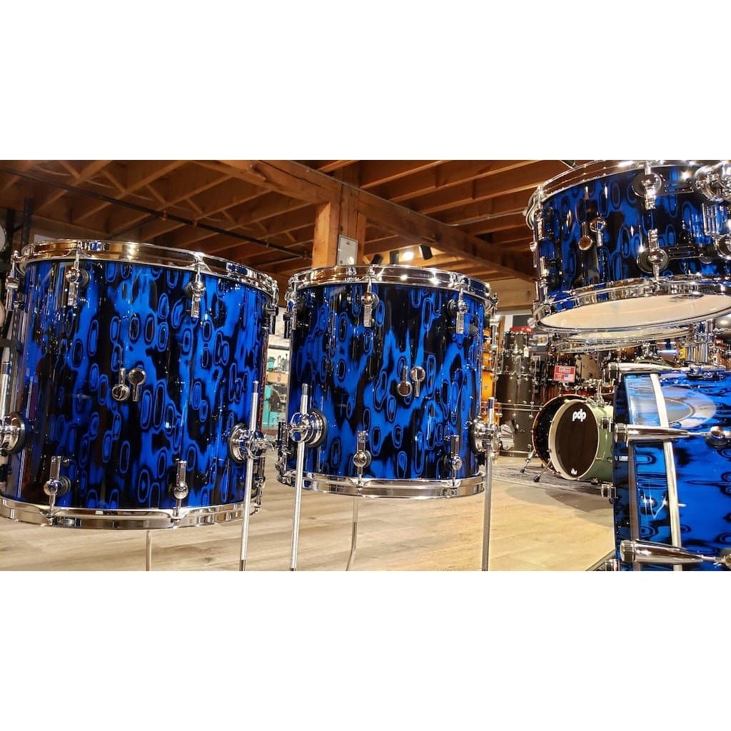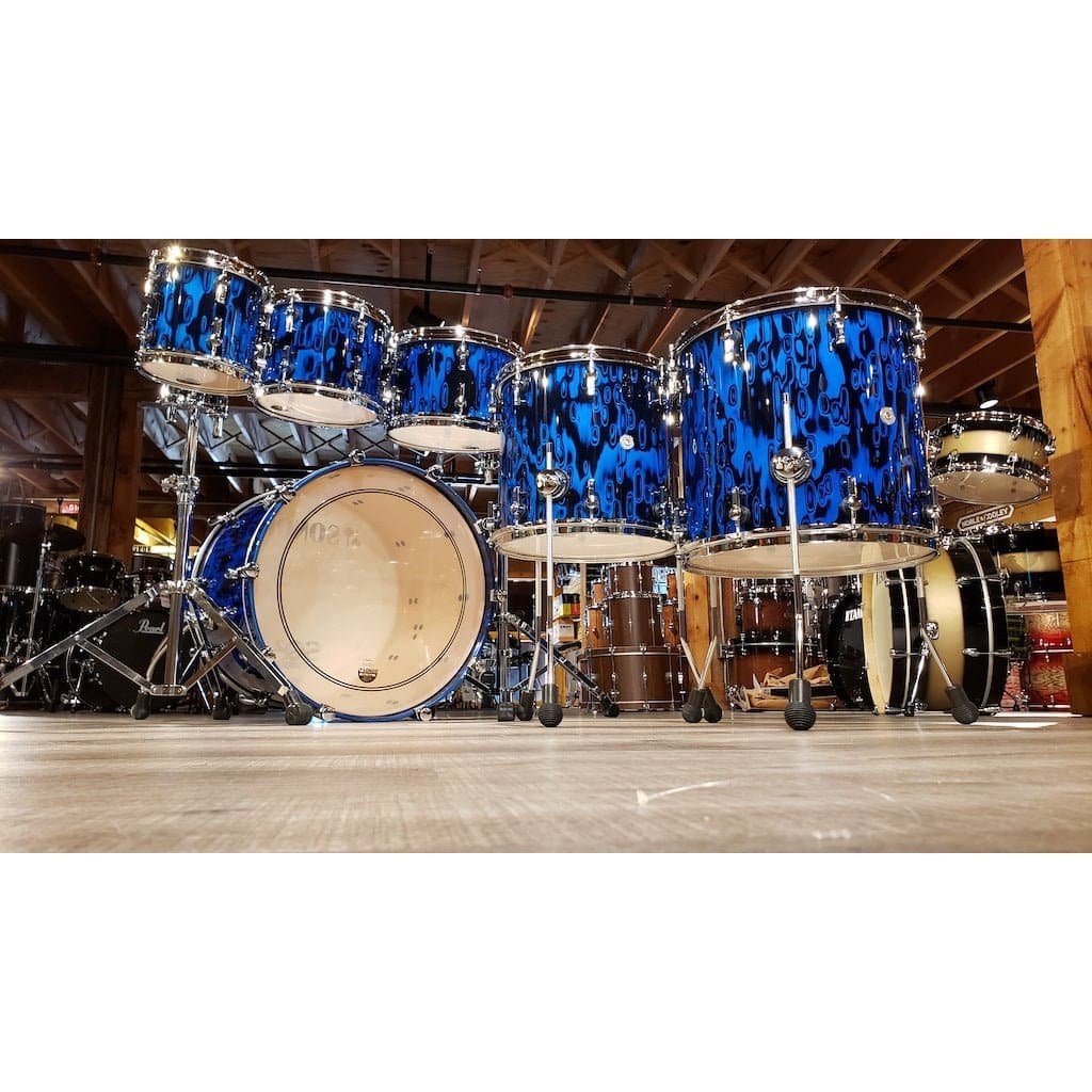 22x18/8x8/10x8/12x8/14x13/16x15. Vintage Maple Shells, High Gloss Blue Tribal Veneer. This is a Shell Pack Only. Pictured Stands are Sold Seperately. Sonor UPID is 1009997-2