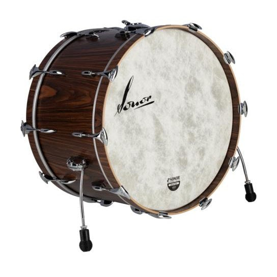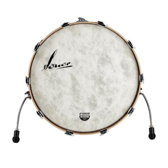 Bass drums come with Classic, VintageStyle Claws with classic design tuning wing screws. 18" and 20" bass drums come with Powerstroke3 coated batter, while 22" and 24" come with Powerstroke3 Black Dot batter. All bass drums come with Powerstroke3 Fiberskyn resonant heads with the Vintage Sonor script logo.