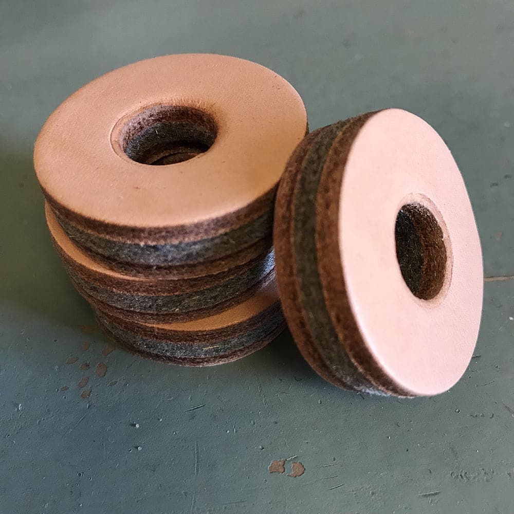 Each washer is 2-ply leather, with a total approx thickness of 3/8" thick. Outer diameter 1.5", Inner diameter .5".