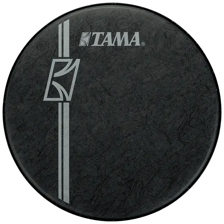 High quality resonant head for bass drum with Tama logo. Black fiber texture with white Tama logo and vertical stripe design.