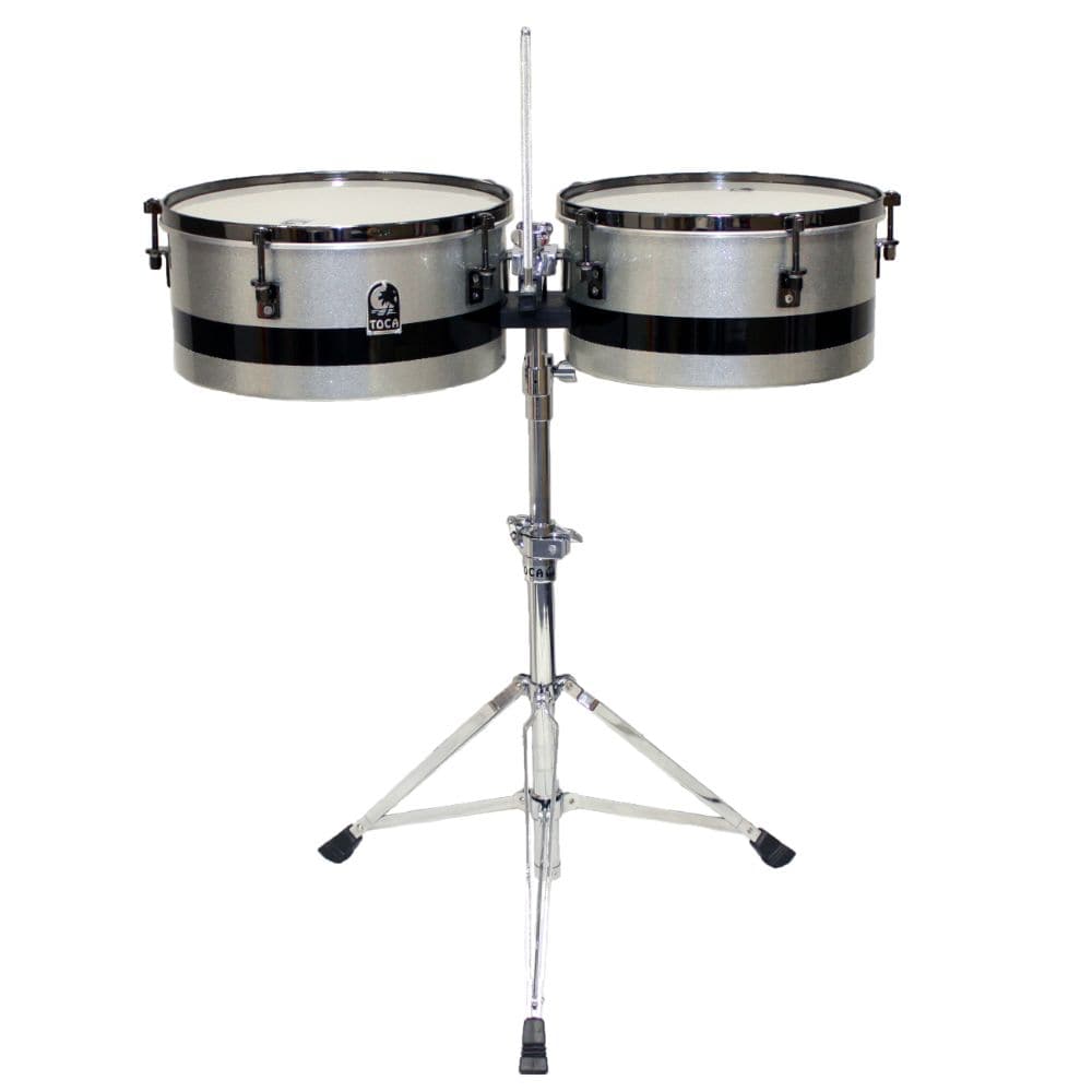 The Toca Eric Velez Signature Series Timbales have been revamped with a classy gun-metal glitter finish and black mirror chrome hardware. These 14 and 15 in. timbales project with a ton of cut. Eric's blurring style is based heavily on Afro-Cuban technique.