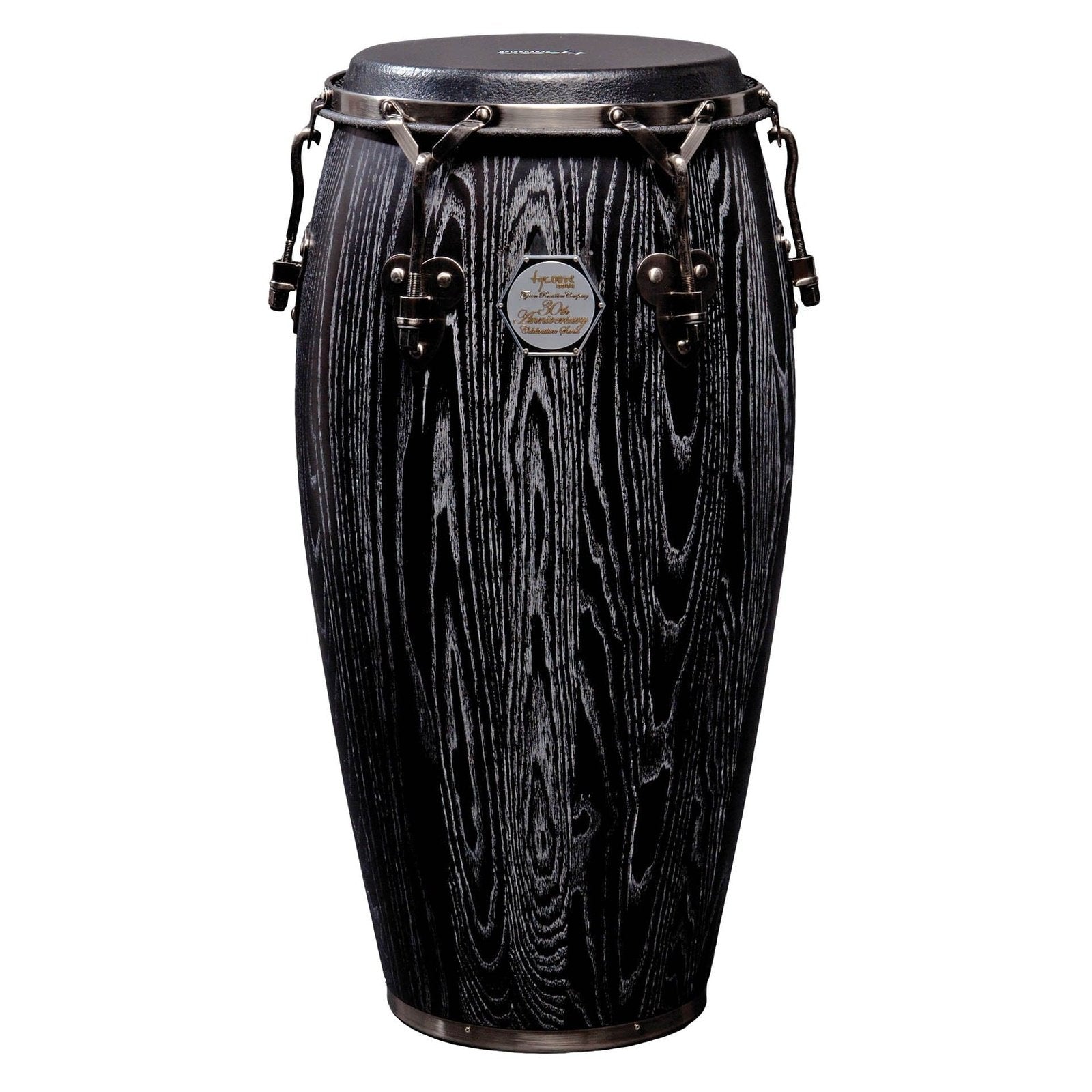 This special anniversary edition requinto is constructed of hand-selected top-grade American Ash wood with special procedures taken in the production process to accentuate patterns of the wood grain. The dark matte finish with white wood grains is one-of-a-kind. The drum is 30 inch. tall with a wide belly that creates rich and deep bass tones and it features brushed chrome Classic Pro(TM) hoops and reinforced side plates with 3/8 inch. diameter tuning lugs. Equipped with a genuine calfskin head that has undergone a distinctive technique to be colored black to match the drum's finish while maintaining the rich warm tone. A matching single basket stand is included.