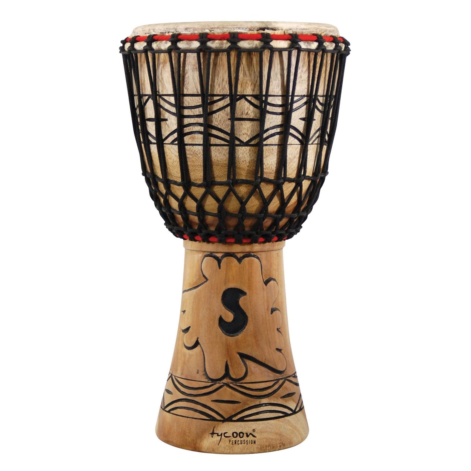 These traditional African Djembes feature shells hand-carved in Ghana from a single piece of hardwood. Premium quality unbleached goatskin heads provide for superior tonal qualities. 5mm non-stretch rope allows for easy and long lasting tuning.
