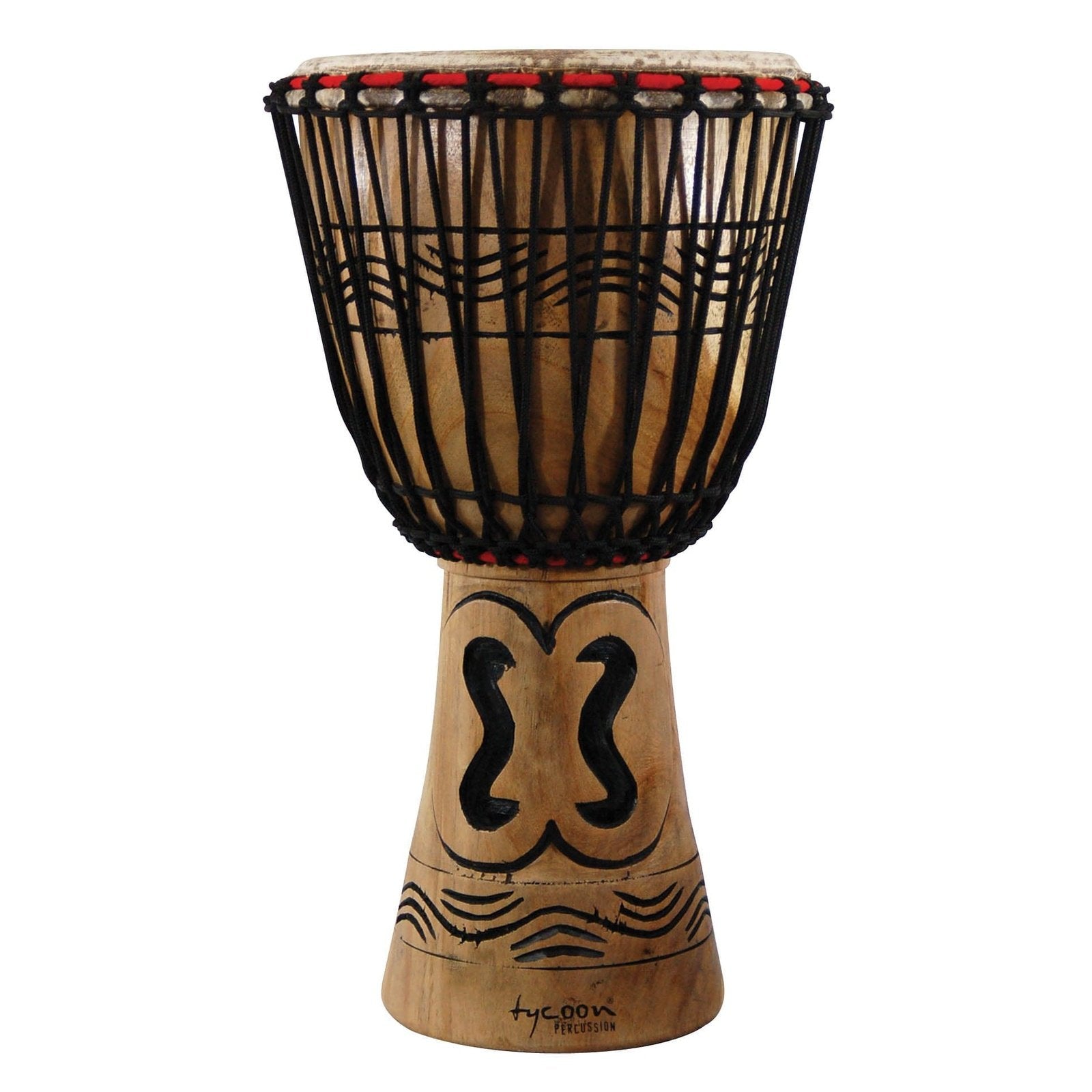 These traditional African Djembes feature shells hand-carved in Ghana from a single piece of hardwood. Premium quality unbleached goatskin heads provide for superior tonal qualities. 5mm non-stretch rope allows for easy and long lasting tuning.