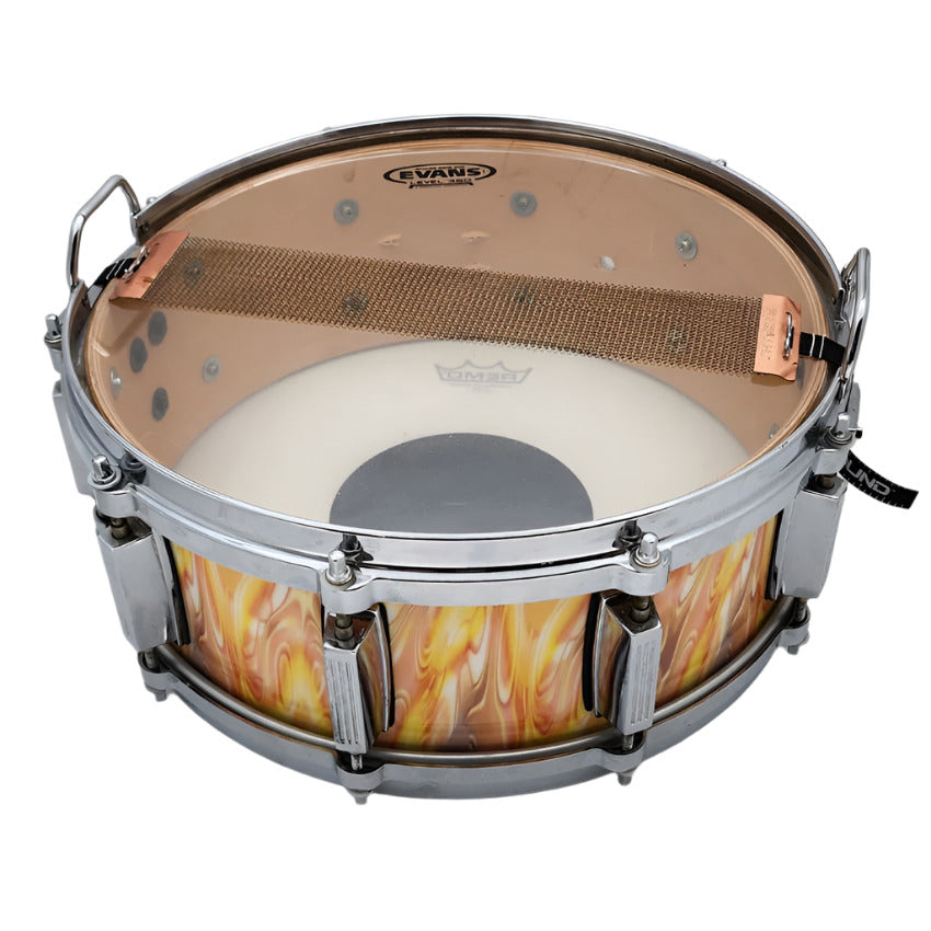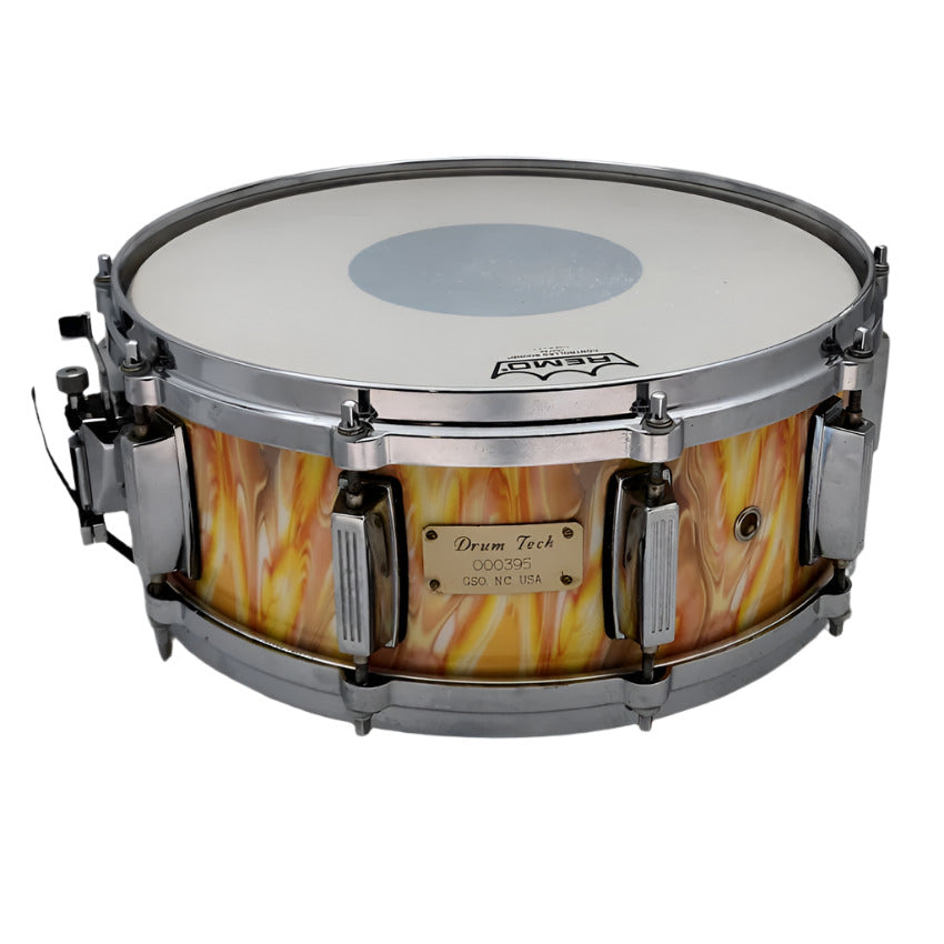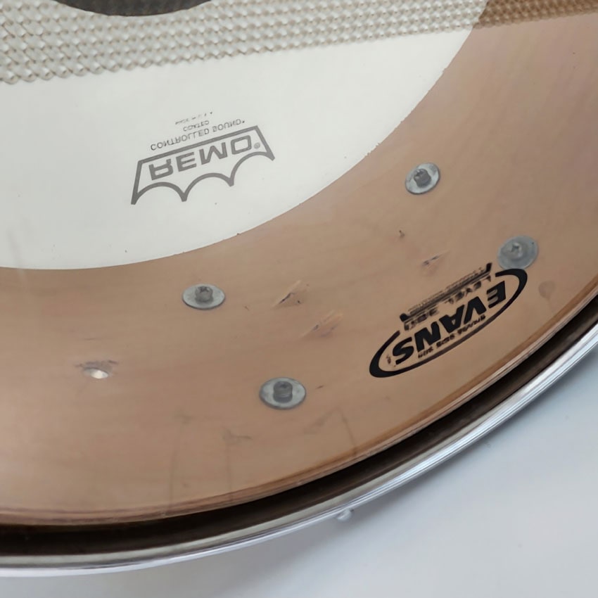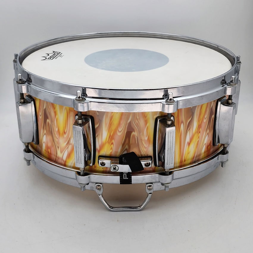 Fair condition. Custom made snare drum. The badge screws come through the shell splintering the inner ply.