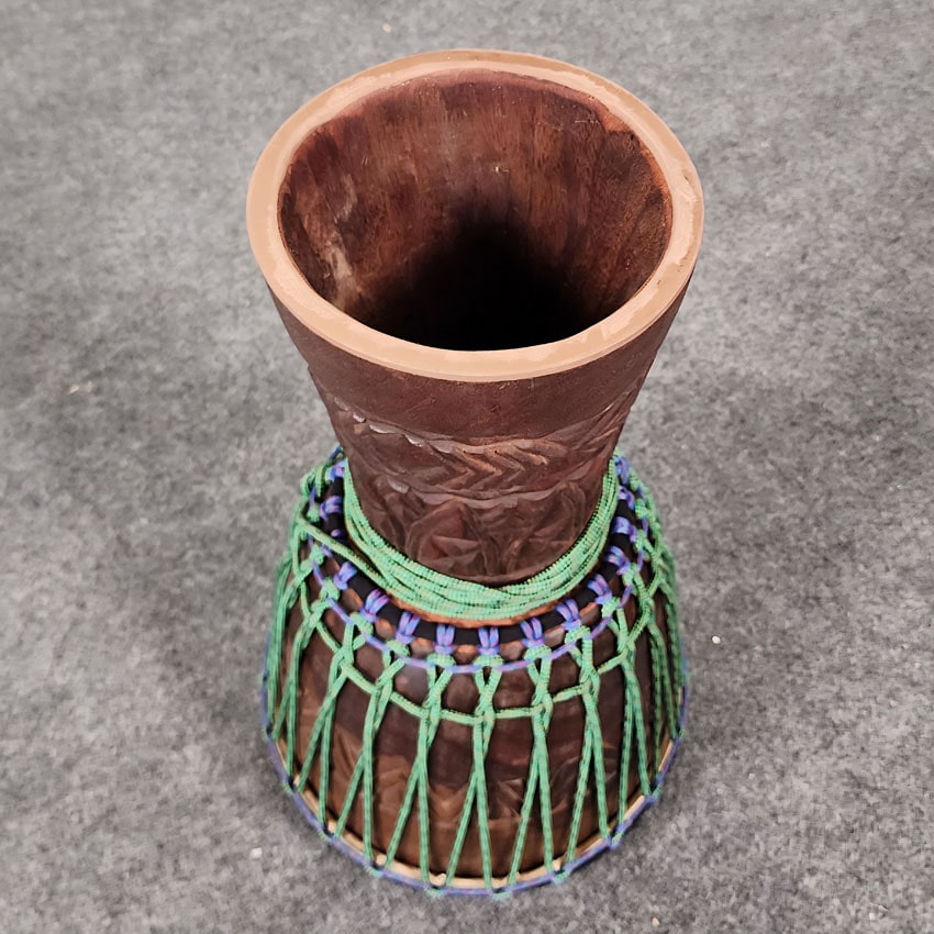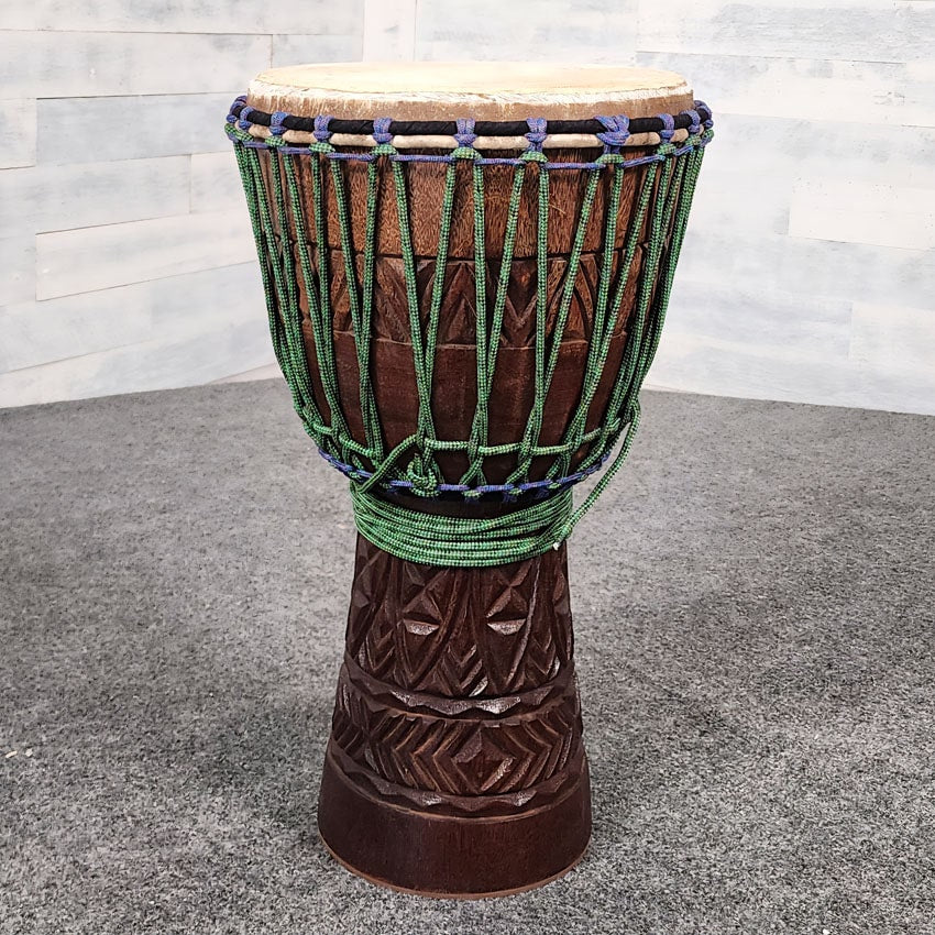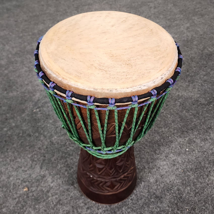 Very Good Condition. Hand carved rope tuned djembe. 13" diameter and 24" Height.