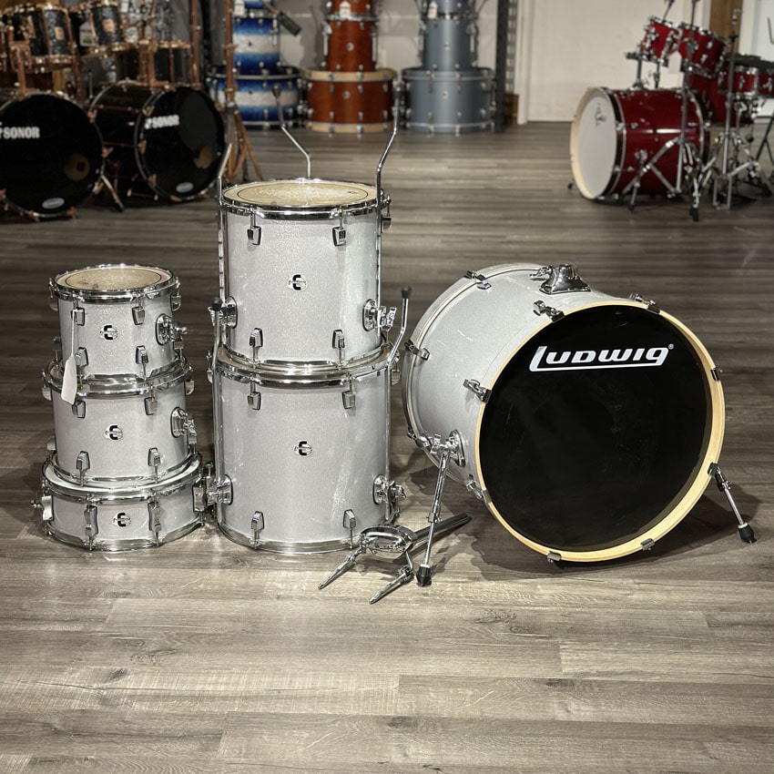 Good condition. All parts present and functional. Floor tom legs and Ludwig double tom holder included.