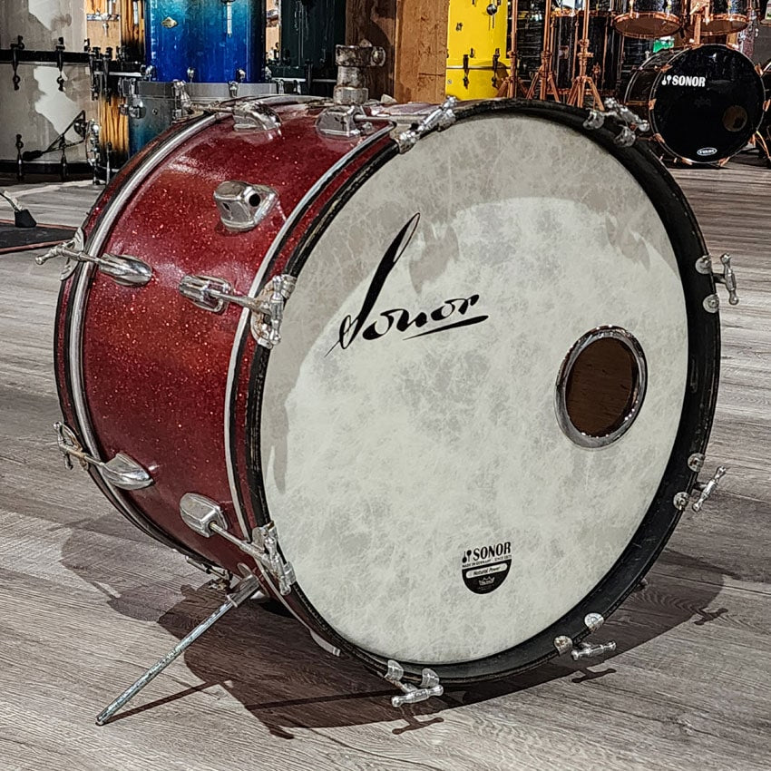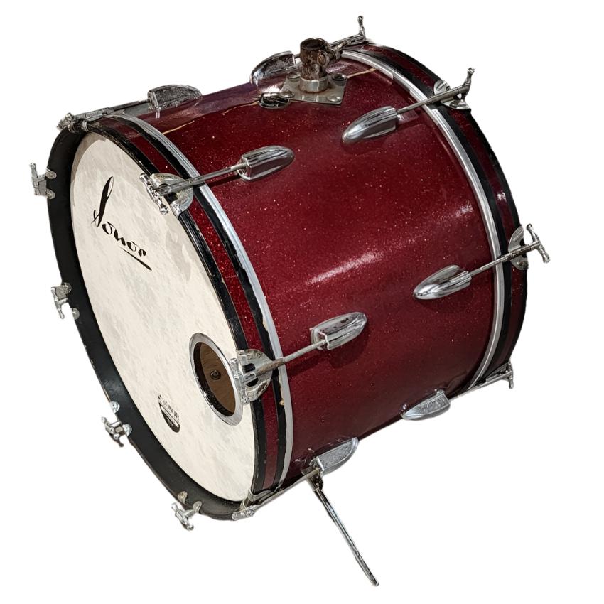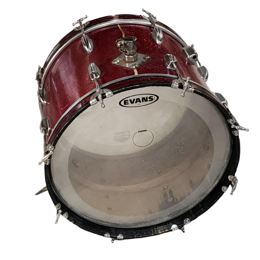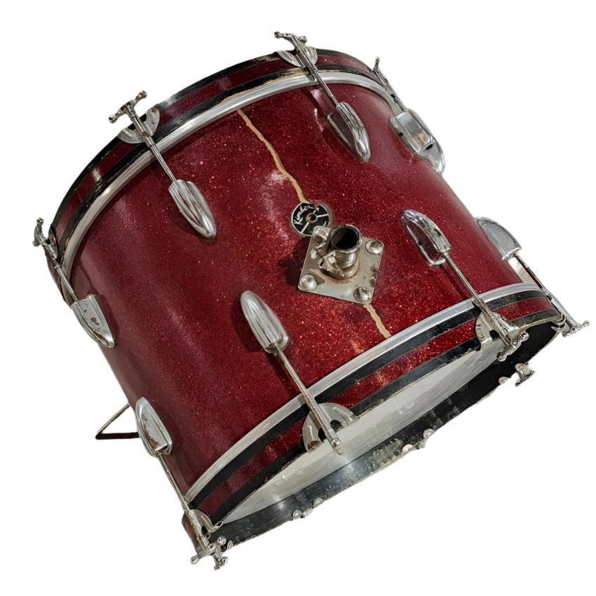 Fair Condition. This drum has new heads some replaced t rods. The wrap is peeling at the top and the hoops have plenty of rash but this is a great sounding vibey bass drum. 20x14