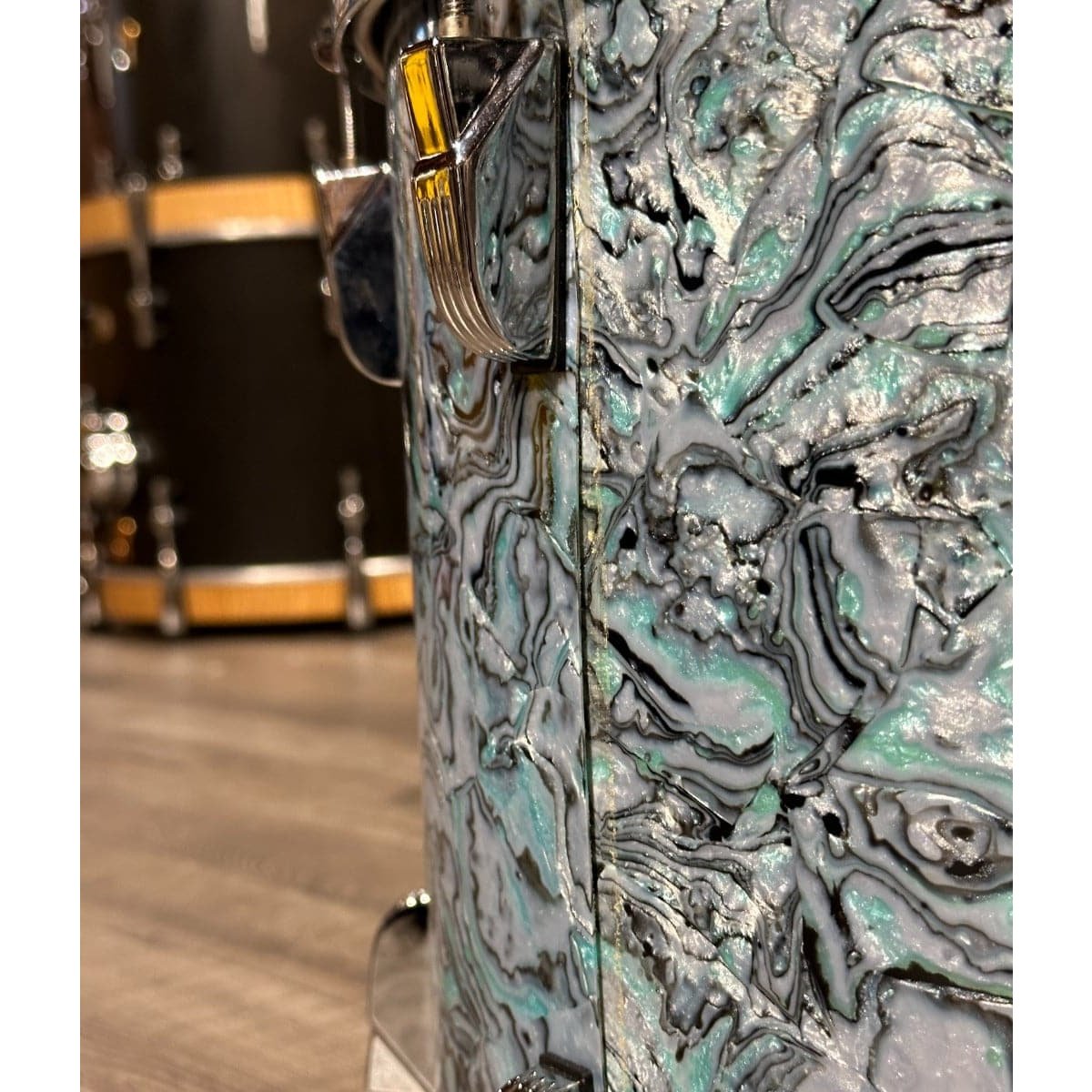 Very good condition. Straight wall maple shells built by Joe Montineri in the mid-1990s. 20x16, 10x9, 12x10, 14x12 (suspended), and 14x5. The suspension mounts are included. The Blue Abalone wrap has a history of shrinkage, and this is present on the bass drum as shown in the photos. There is minor lift at the seams of the other drums. This is a one owner kit that has never been gigged, and barely played!
