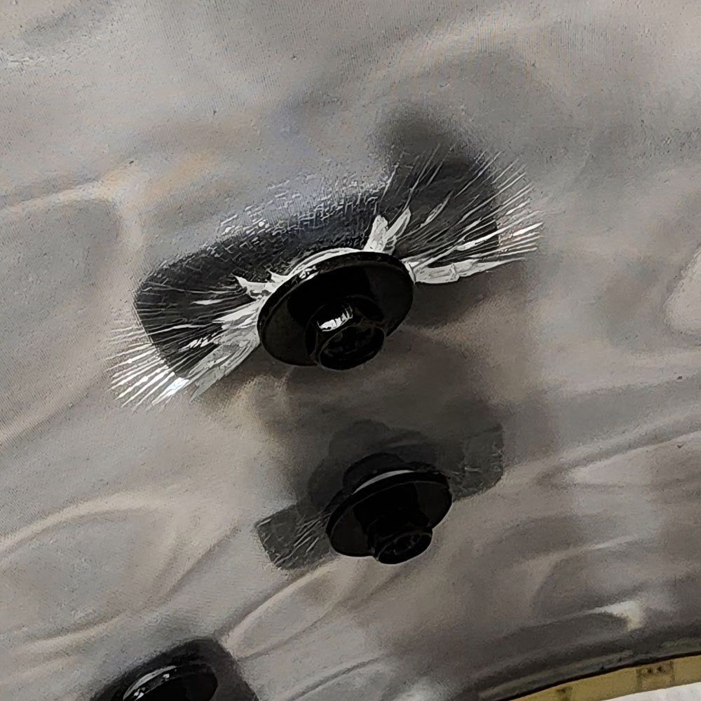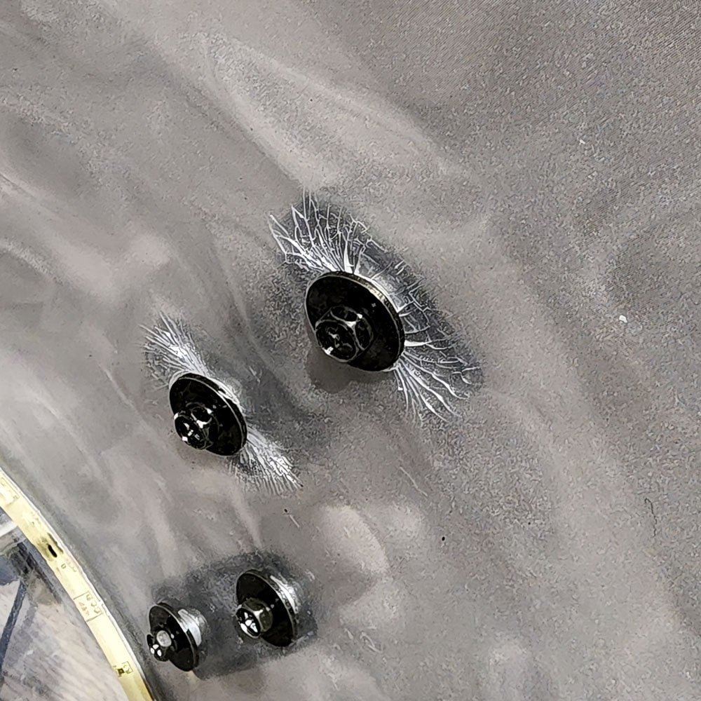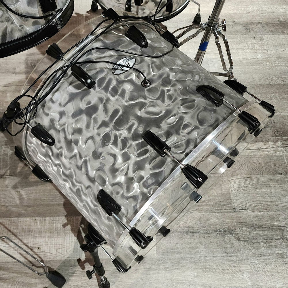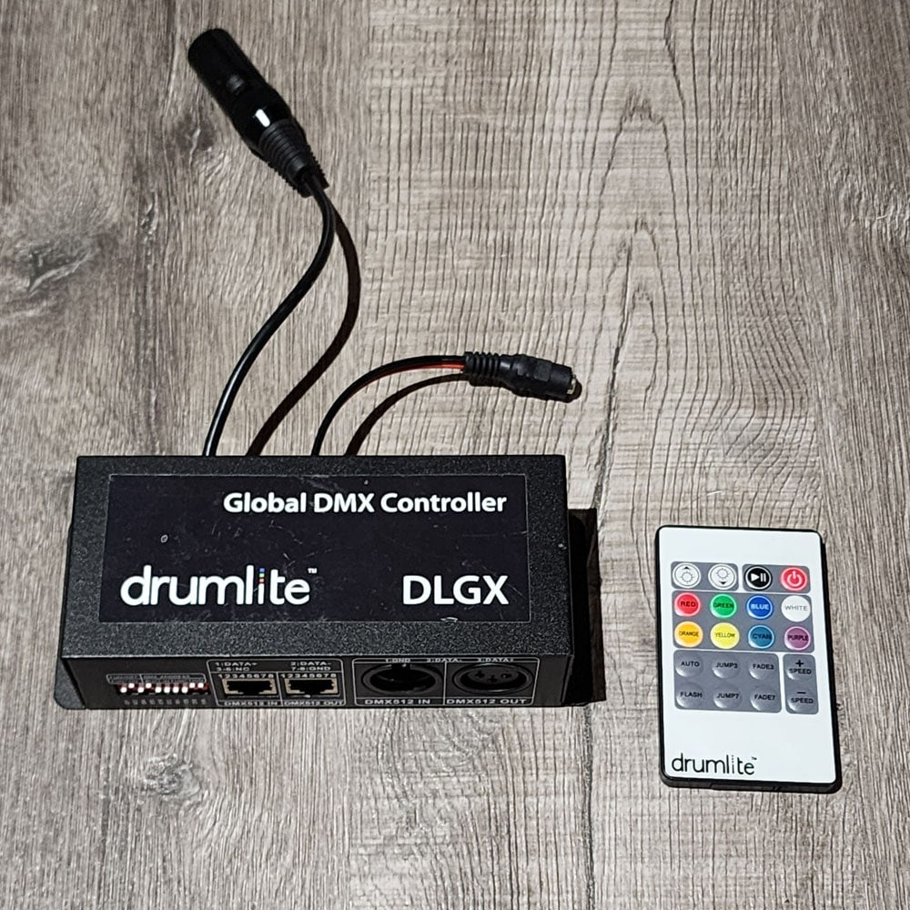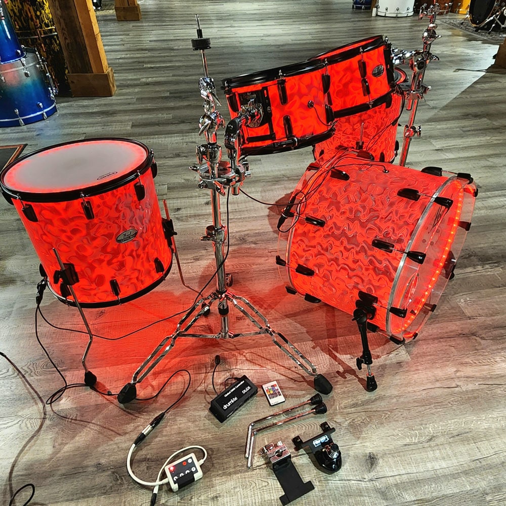 Fair condition. 10x7 & 12x8 Toms, (2) 16x15 Floor Toms, and a 22x16 Bass Drum. This was a limited release drum set from Pearl outfitted with the [now discontinued] DrumLite system. This set comes with two Pearl ADP30 clamps and two Pearl short tom holders. Also included is a Pearl Jungle Gig Floor Tom To Bass Drum Adaptor for 16" drums. One of the floor toms is set up to be used as a bass drum, and it has some spiderweb cracks around the tom brackets. A DMX controller is also included (not tested).
