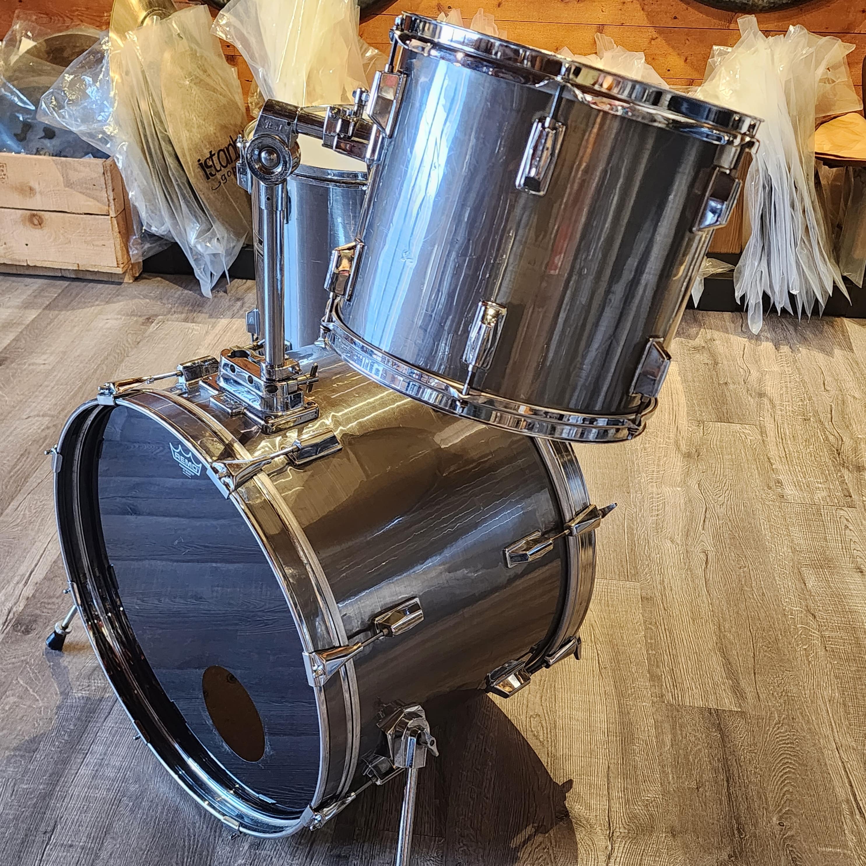 Fair condition. Some bubbling on the wrap on each of the drums. Bearing edges and hardware are in good shape. Legs and tom arm are included. 13x10, 16x16, 22x16.