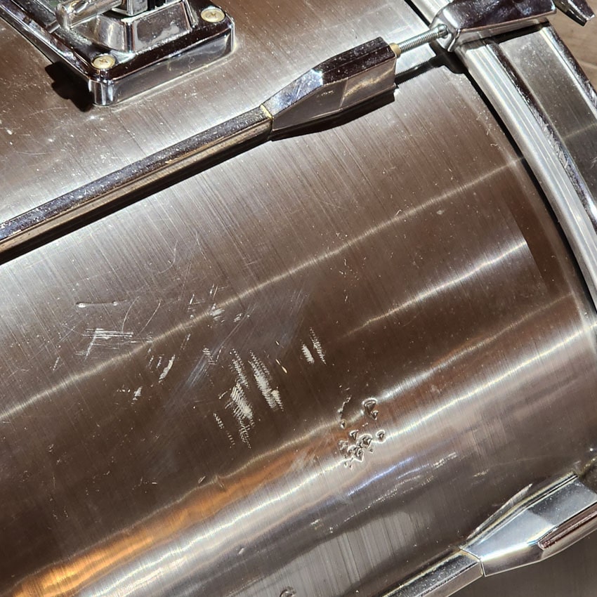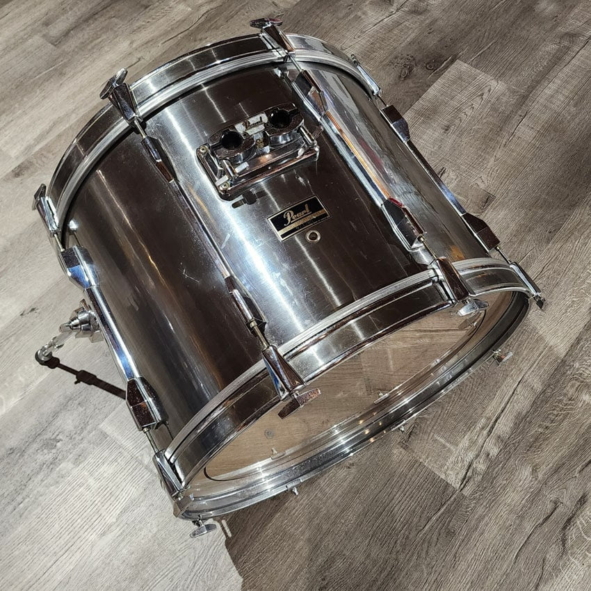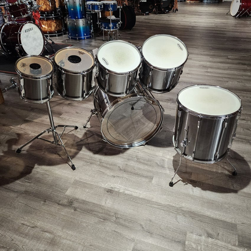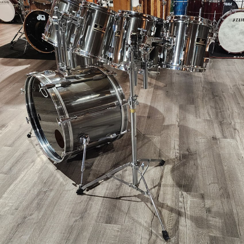 Good Condition. All parts present and functional. This set saw plenty of gigs and has some dings and scratches on the wrap most notably on the bass drum and floor tom. Shells and hardware are clean with no issues. Includes double tom stand and pearl arms for the bass drum. Sizes for this kit are 8x8, 10x10, 12x10, 13x11, 16x16, 22x16.