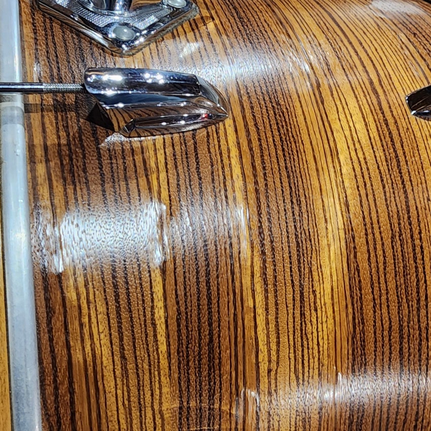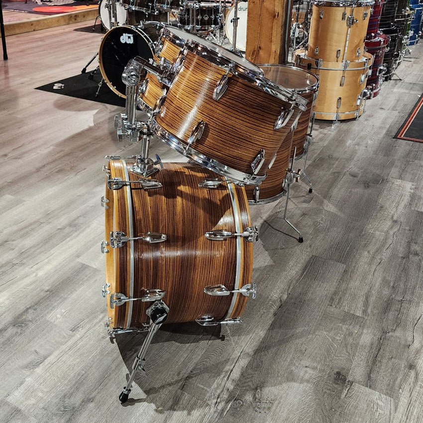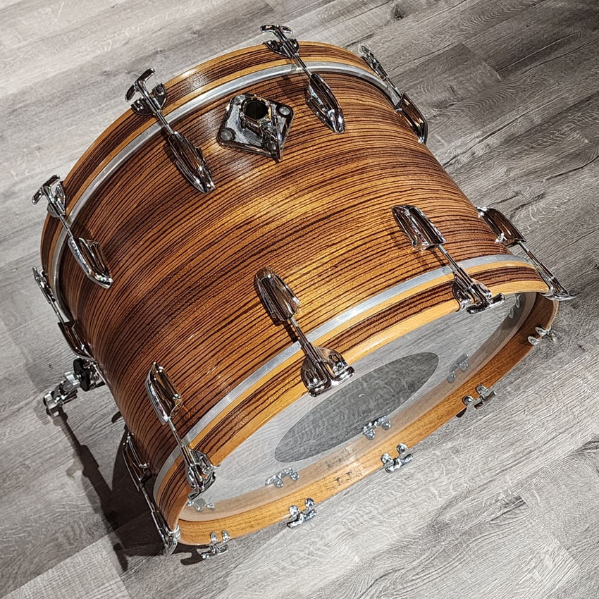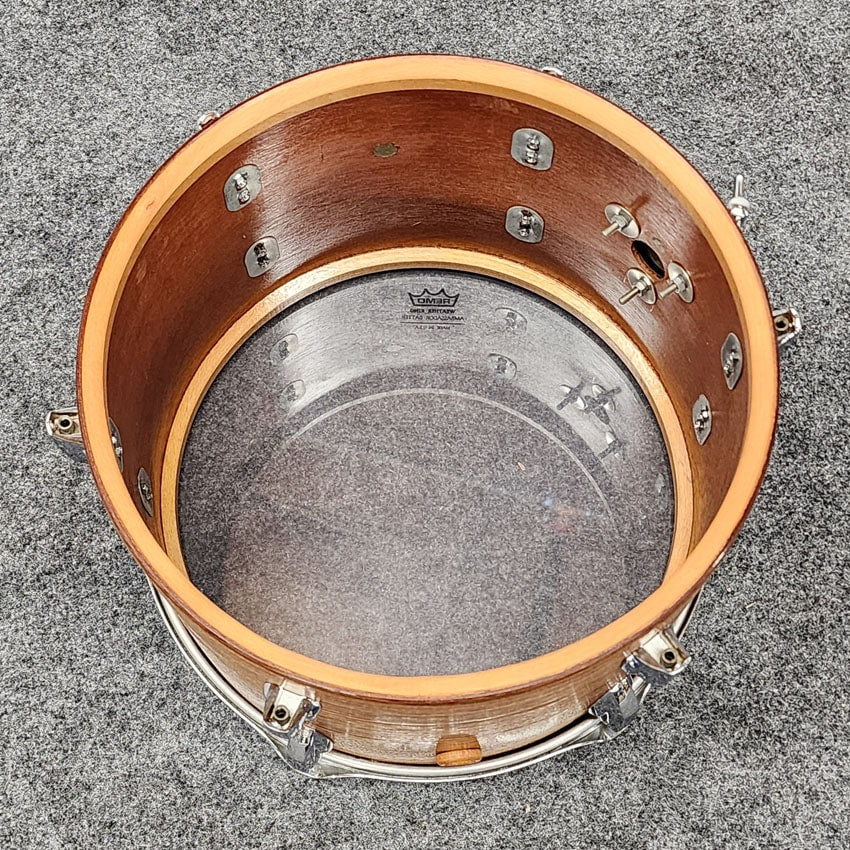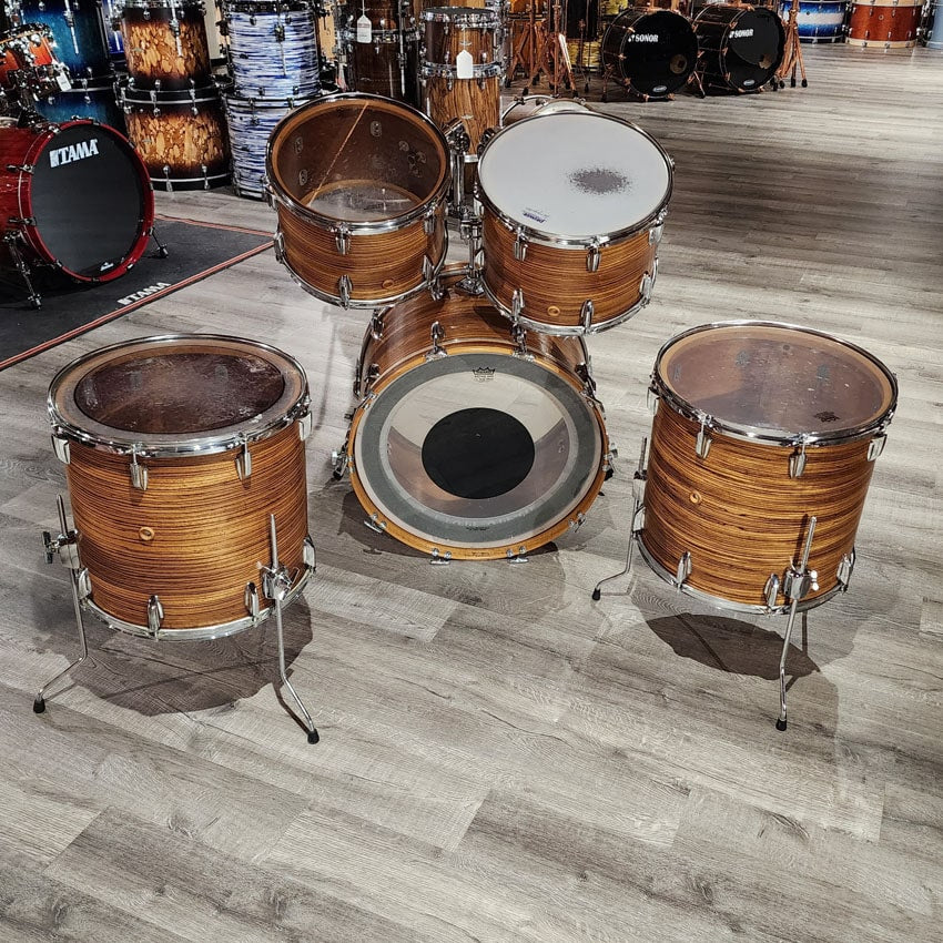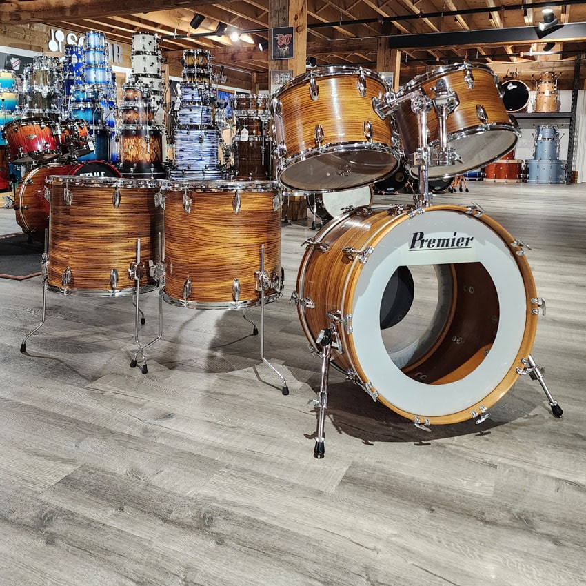 Good Condition. All parts present and functional. Original mounting hardware on bass drum and toms replaced for Pearl toms arms and brackets. Original Premier hardware on floor toms. All mounting hardware is included. This kit had its edges recut and was refinished at Precision Drum Co. Some bubbling in the finish but no major issues with the finish. The Shell is a Mahogany shell with Beech reinforcement rings. Sizes for this kit are 13x9/14x10/16x16/16x16/22x14.