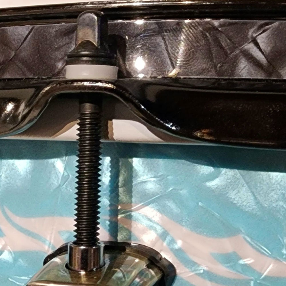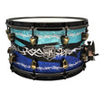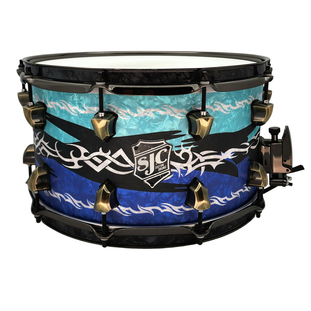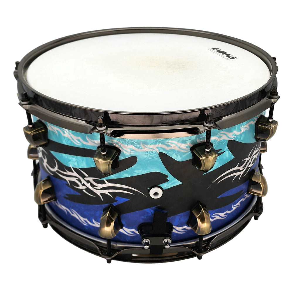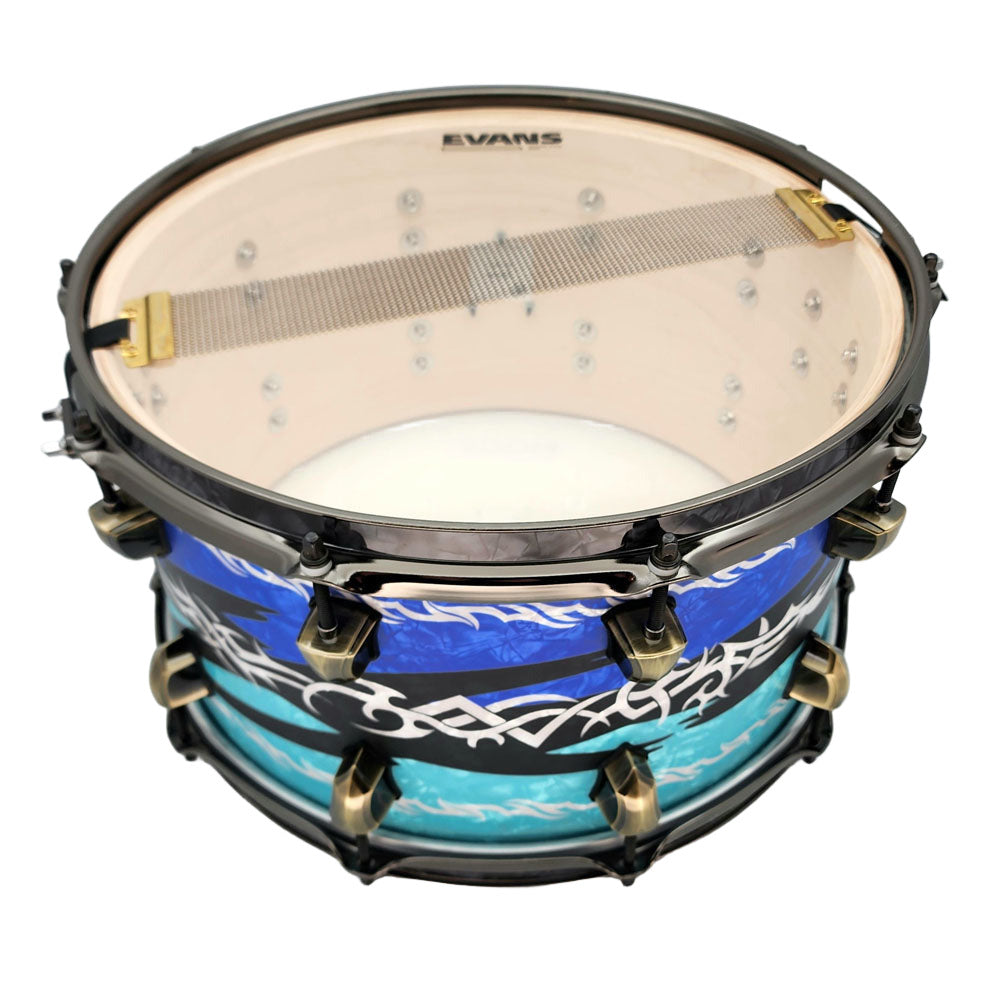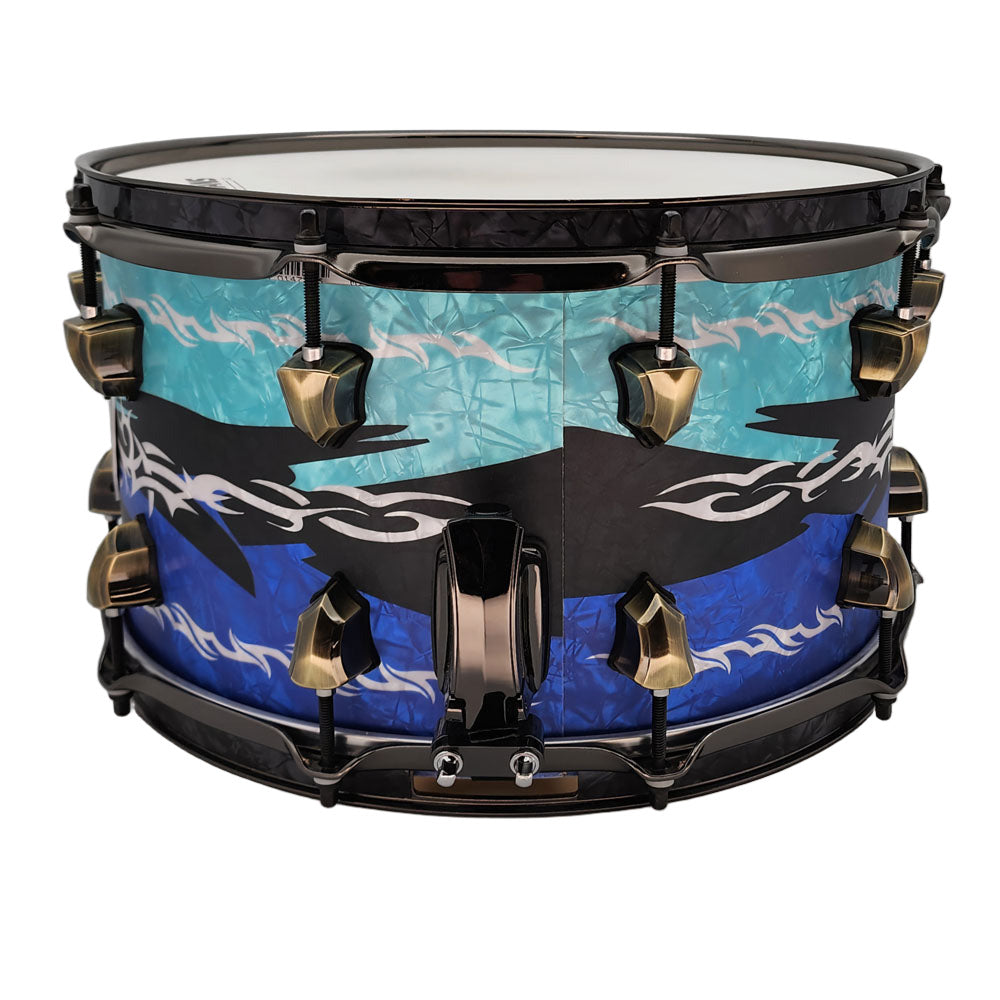 Very Good Condition. This was a custom ordered drum and has a lot of features to show for that. A custom wrap finish with Brass lugs, black nickel hardware and an inlay on the triple flanged hoops. Complete on a thicker maple shell makes this a unique drum. All parts present and functional.