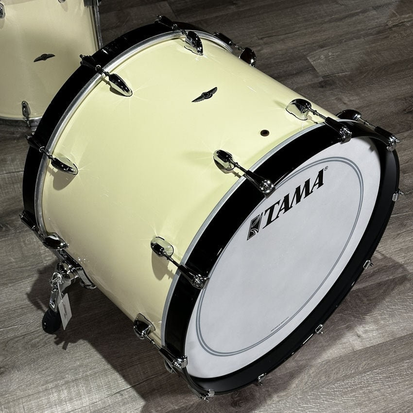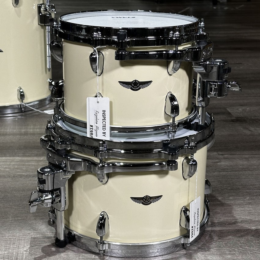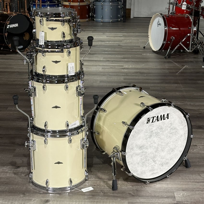 Excellent condition, virtually unplayed. One of the original Antique White bass drum hoops was cracked in transit. Both hoops have been replaced with Gibraltar black lacquer hoops. Both of the original Tama hoops (including the one that is cracked) are included with this set, along with the replacement Gibraltars.