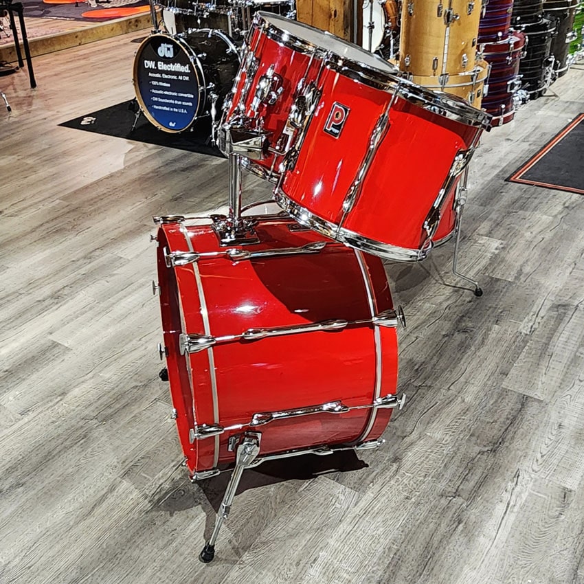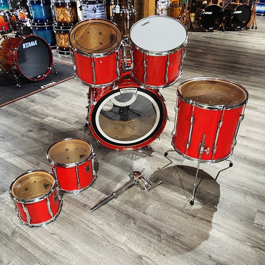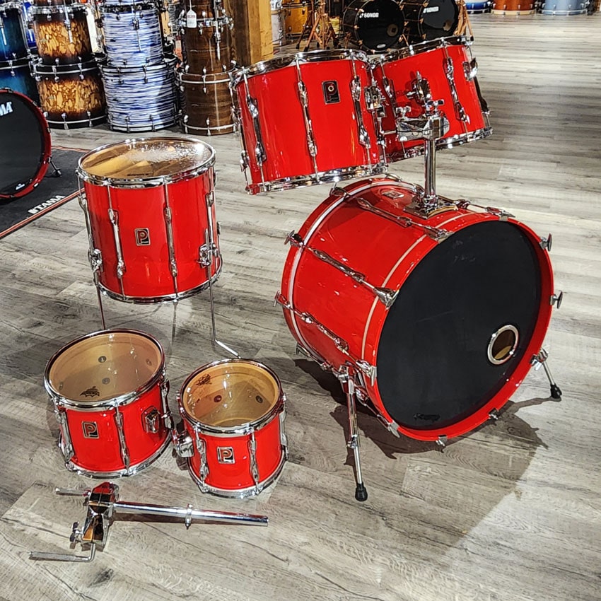 Good Condition for their age. Small marks around the set and hoops but no incredible gouges. Some scratches and scuffs from being gigged over the years but all the hardware is very clean and no issues with the shell interiors or bearing edges. Mounting hardware is included with kit. Birch shells with beech reinforcement rings. Sizes for these drums are 10x9, 12x10, 13x11, 14x12, 16x16, 24x16.