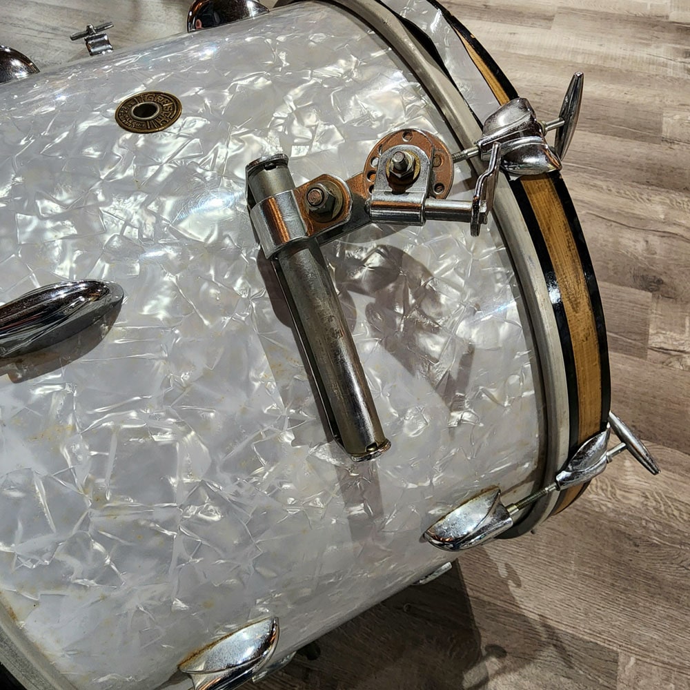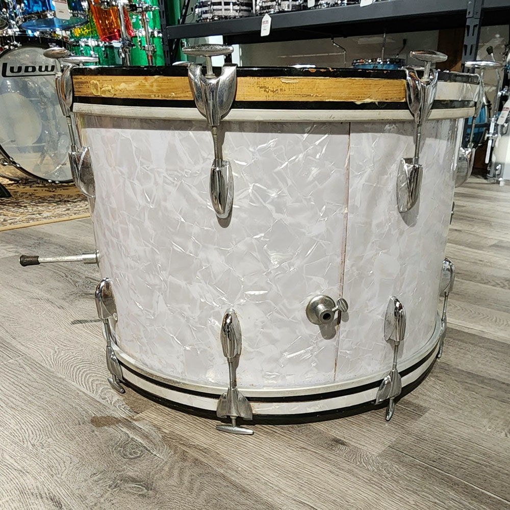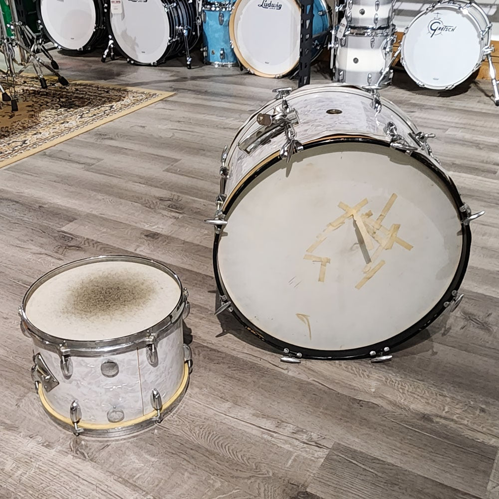 Fair condition. Wrap is lifting on both drums. One bass drum leg is missing. All parts are original including batter side heads. sizes: 13x9 and 22x14.