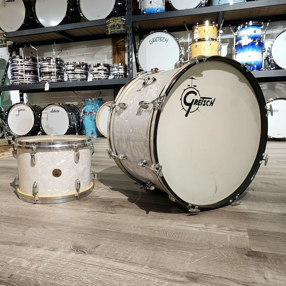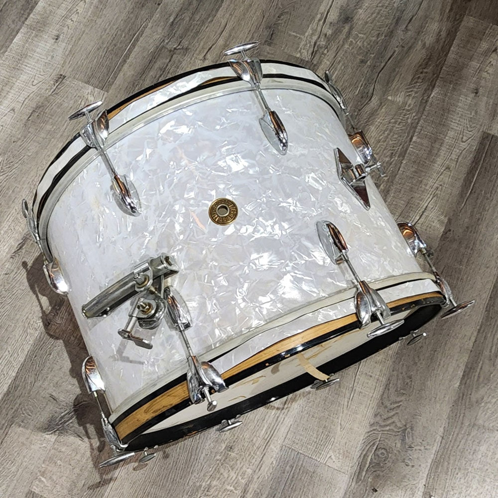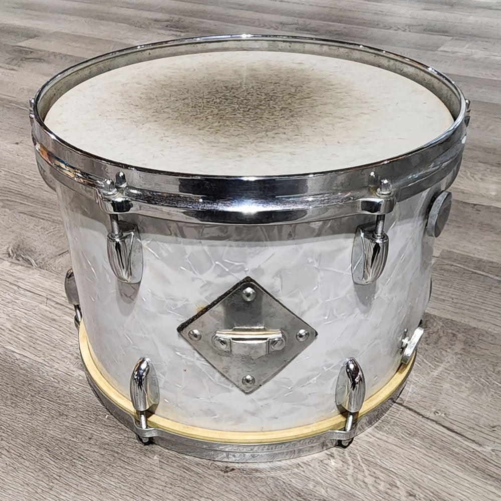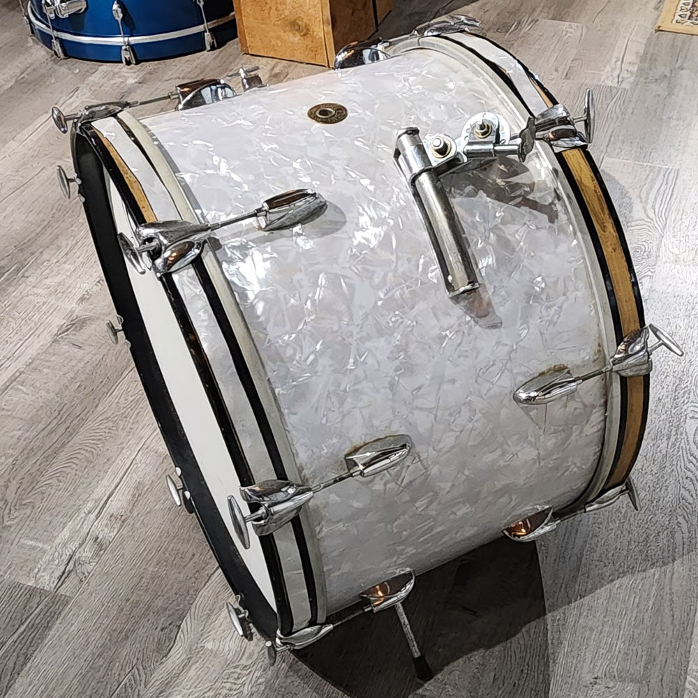Fair condition. Wrap is lifting on both drums. One bass drum leg is missing. All parts are original including batter side heads. sizes: 13x9 and 22x14.
