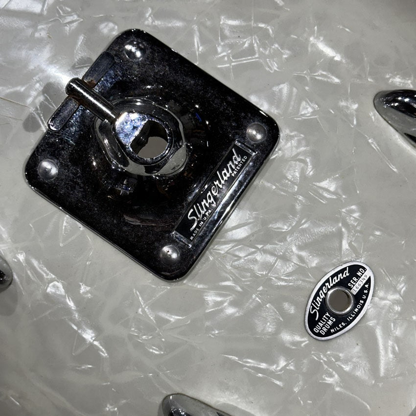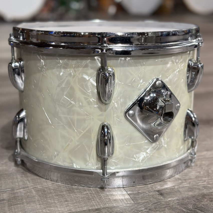 Fair condition. 12x8, 13x9, 16x16, 20x14 & 14x5.5 solid ply matching snare drum. This is a player's grade kit. Internal dampeners have been removed from the toms and the holes filled with screws. The floor tom leg brackets are reproduction replacements and come with Pearl floor tom legs. Double tom holder has been repaired and is solid. The wrap is in decent shape with some yellowing and slight cracking in places consistent with a drum set of this vintage.