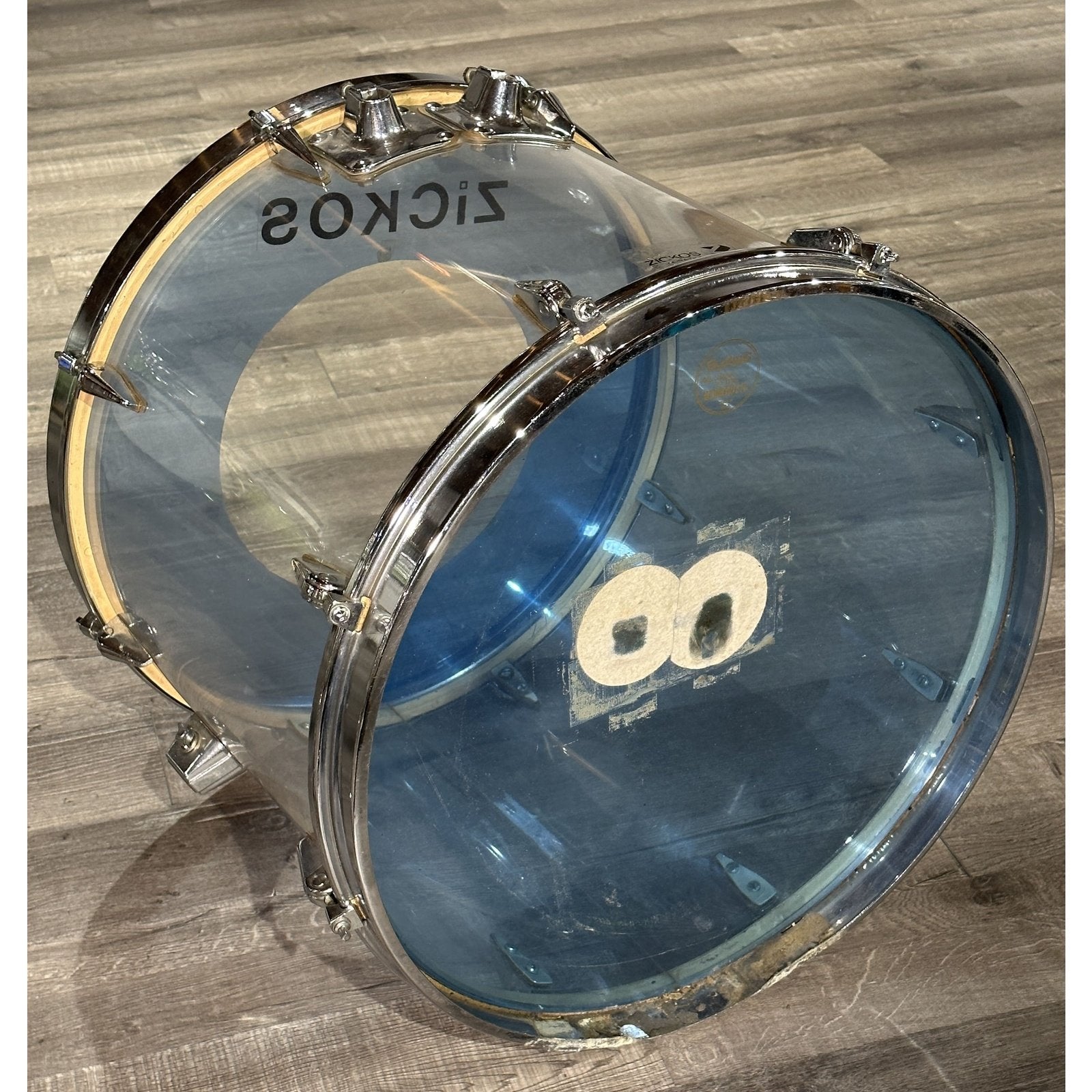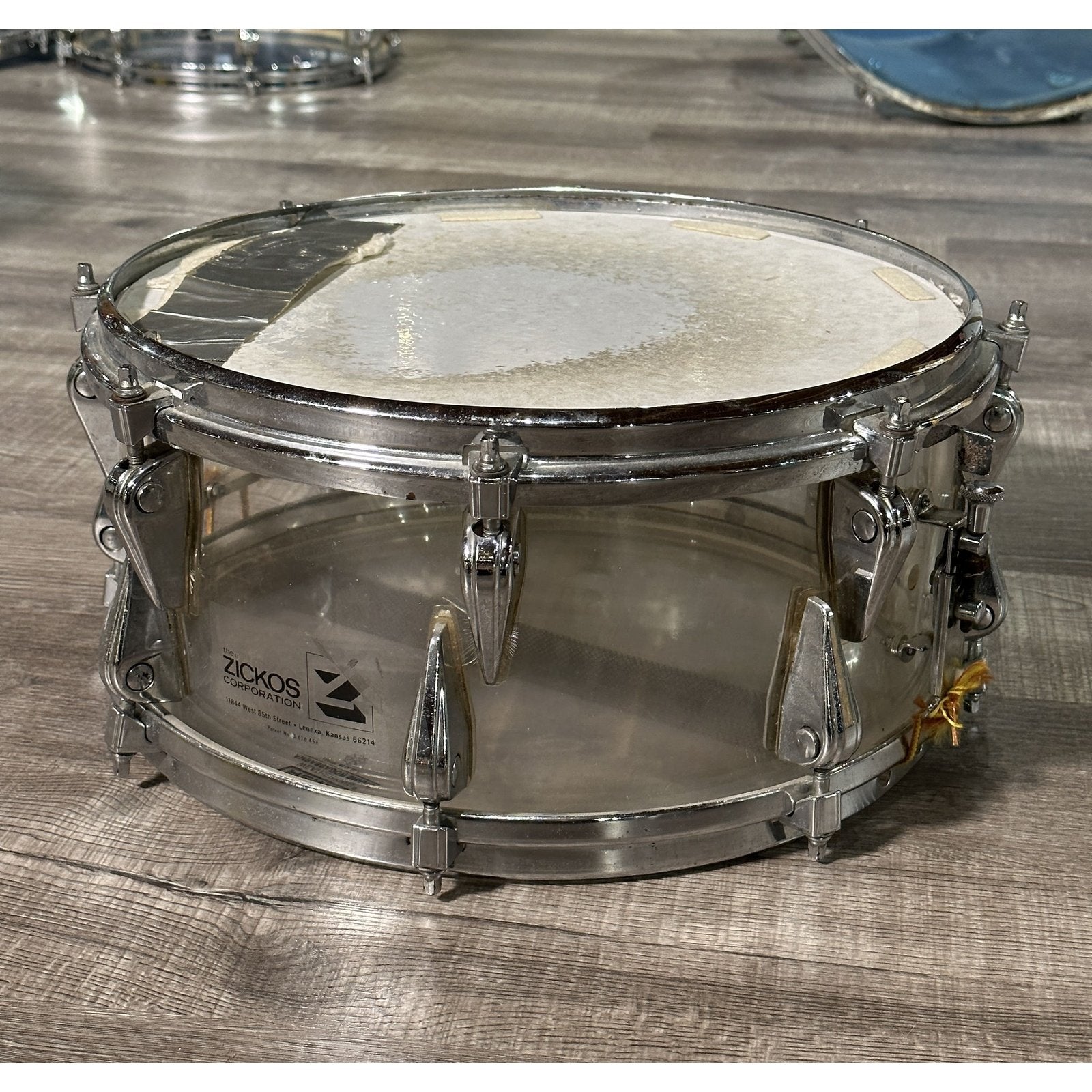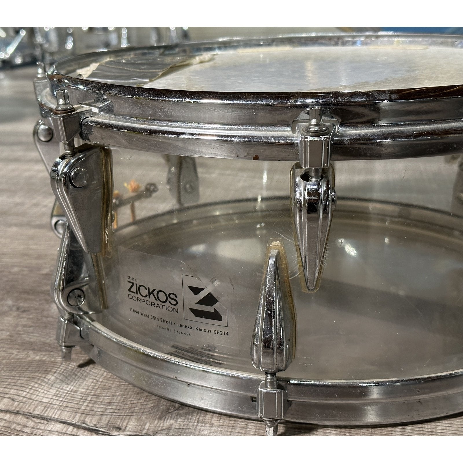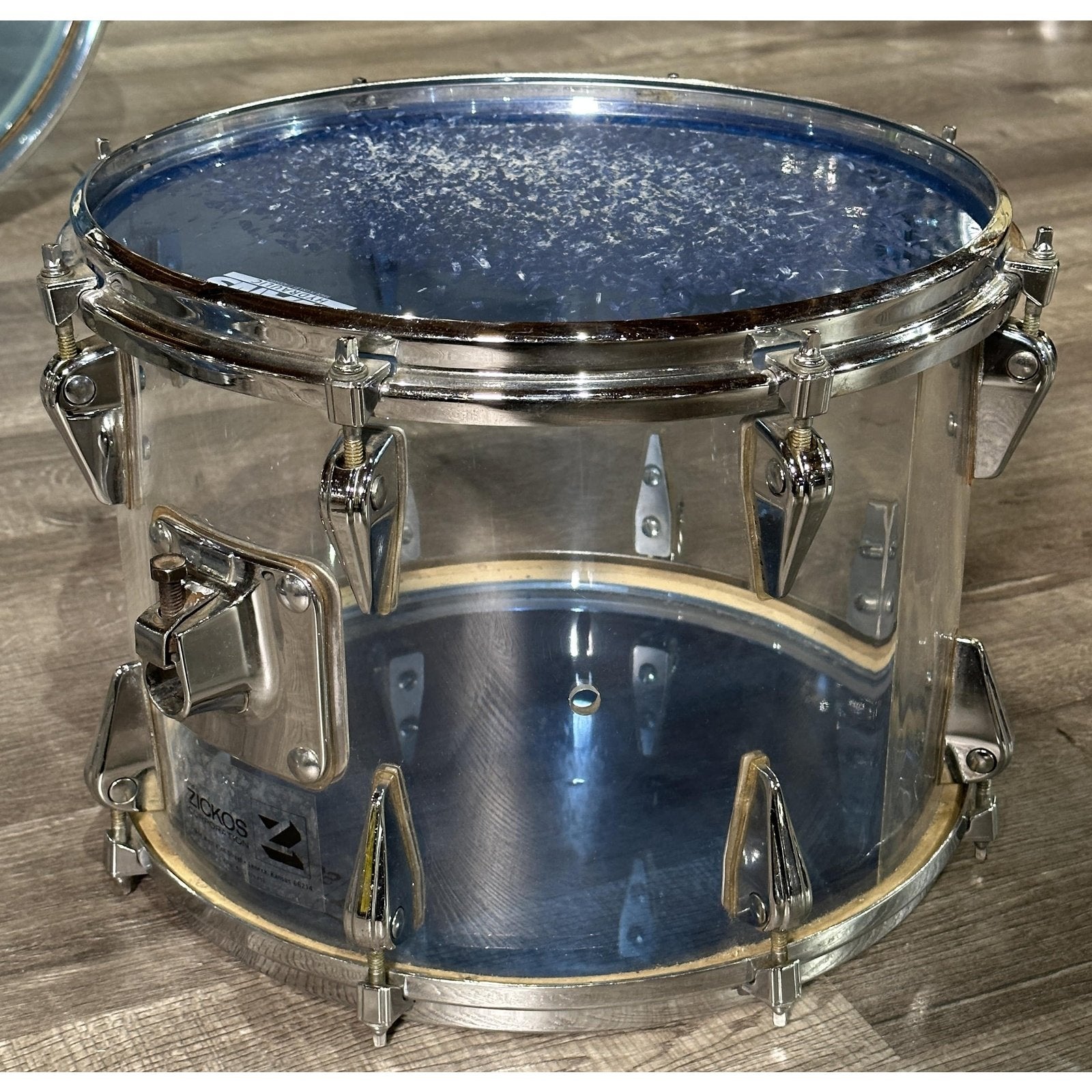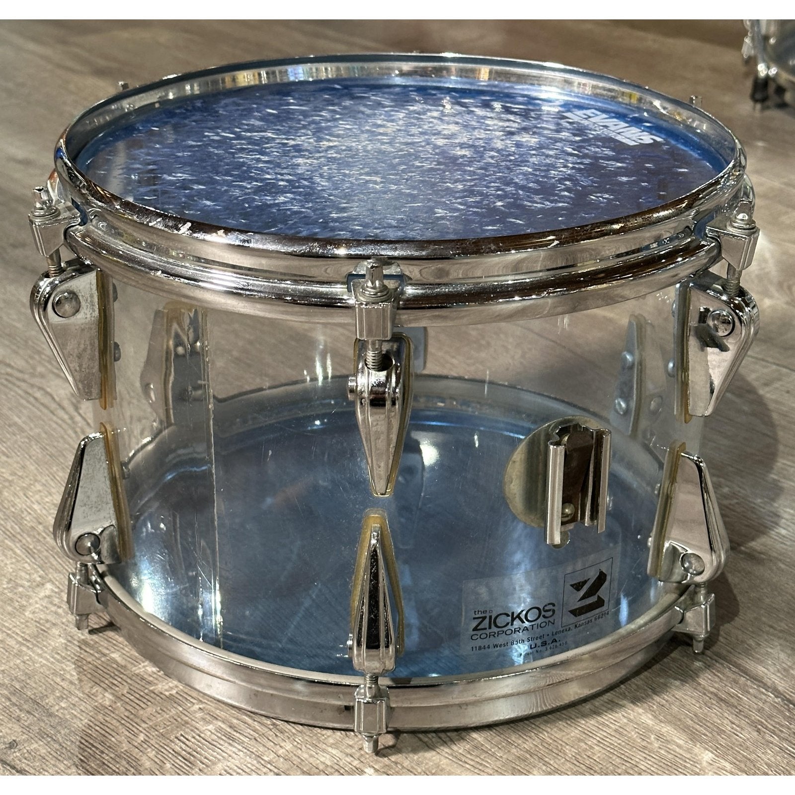 Fair condition. Late '60s Zickos acrylic drums. No splitting at the seams. Some spider cracks around all of the lugs on the snare drum. One small spider crack on the 12" tom. All original tom arms are included as well as spare floor tom brackets along with the original heads. Sizes: 12x8, 13x9, 14x10 (2x), 18x18, 22x18, 14x6.5.