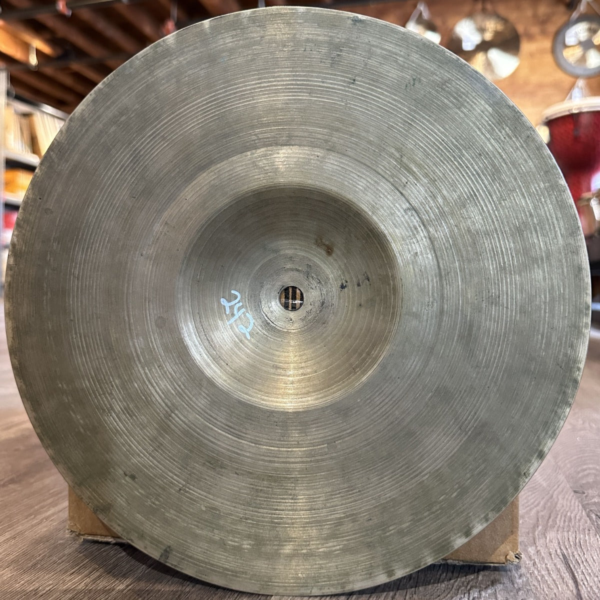 There is no stamp, which leads me to believe this was a second, or sold as a house brand cymbal. I'm guessing this is from the 40's or early 50's. There's a prominent lathe mark on the profile of the cymbal. It's a strange, sweet sounding classic Zildjian