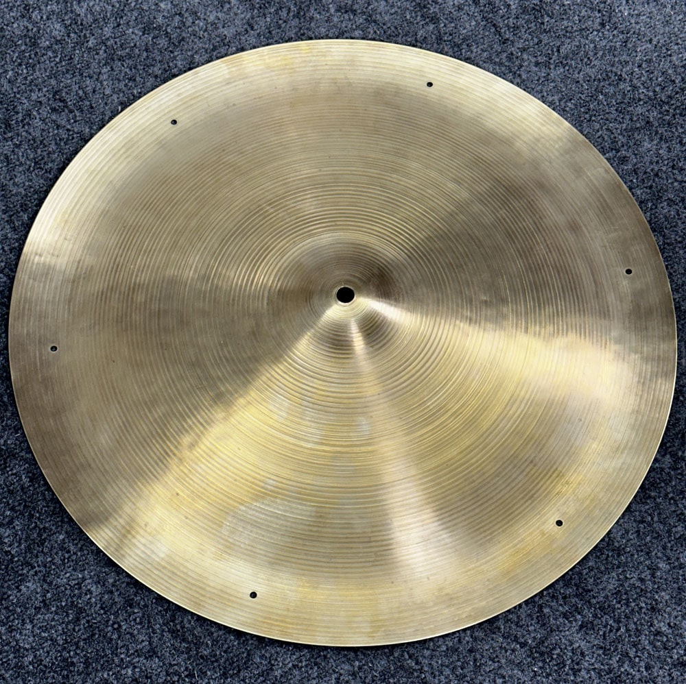 Good condition. No cracks, keyholes, or flea bites. 70s-era Zildjian. Hollow logo. Drilled for 6 rivets, but none are currently installed.