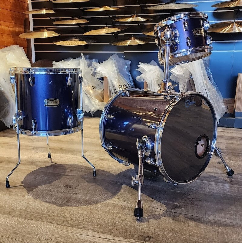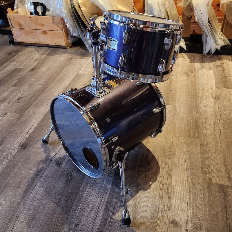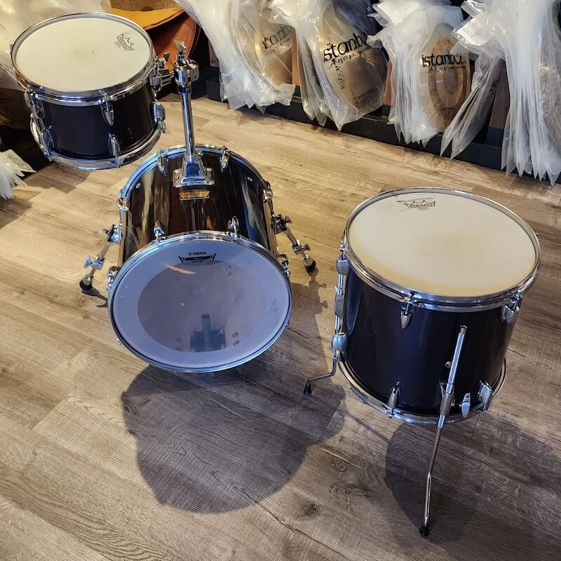 Fair condition. Bearing edges and hardware are in good condition. Drum wrap is scuffed and scratched on every drum. Sizes: 16x16, 13x13, 10x7. Tom arm included.