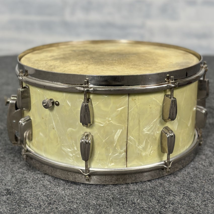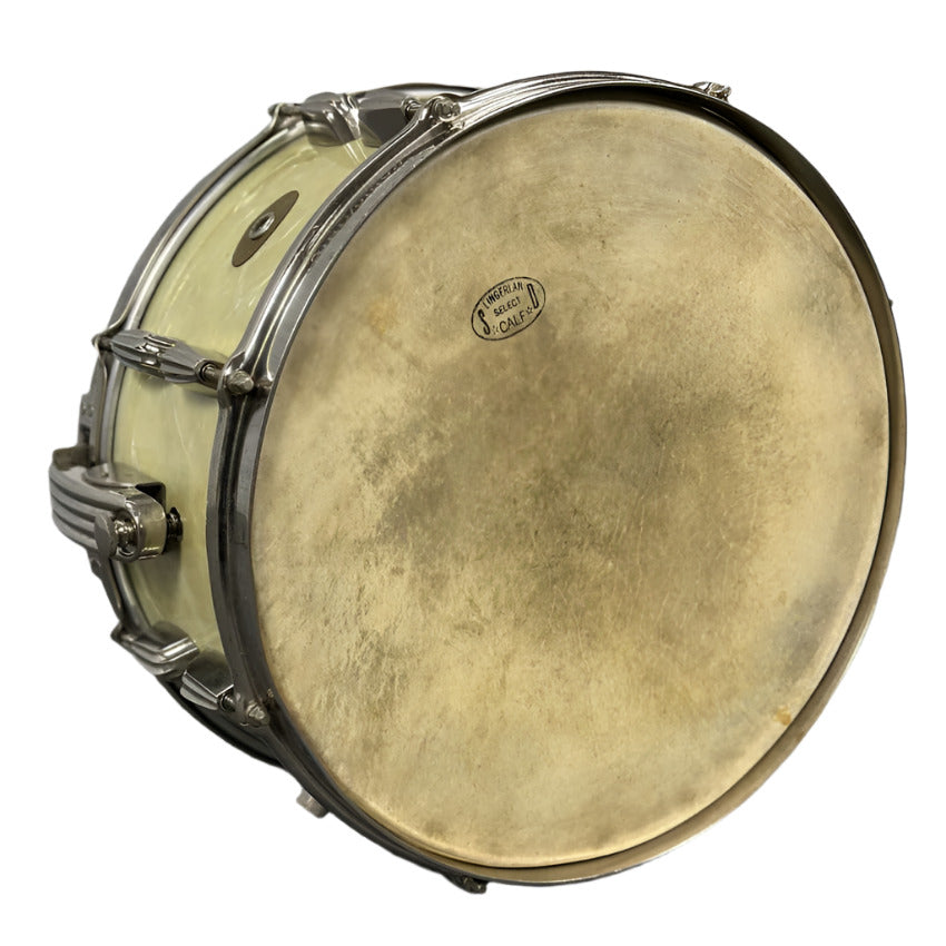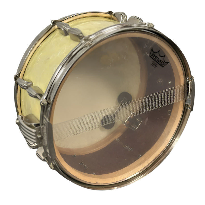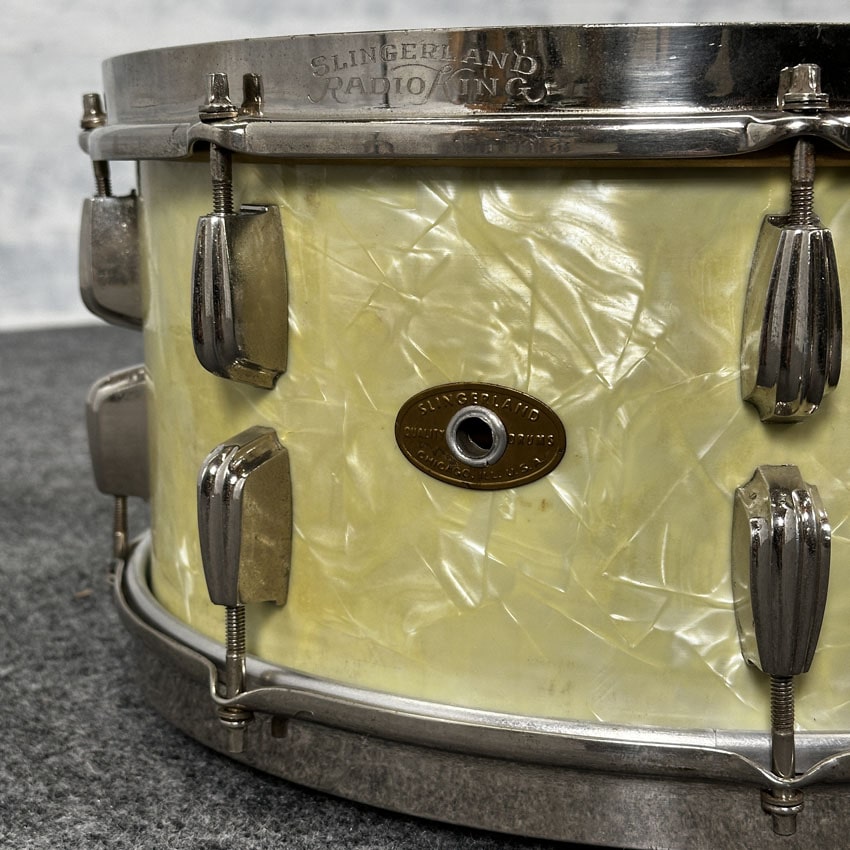 Good condition. This is the real deal! This vintage Radio King snare drum features a mahogany shell with maple reinforcement rings. The arm on the snare strainer is missing, through, reproduction parts for this can be found online. Original internal muffler is present and functional. A Slingerland calf skin head is on the batter side with a Remo Diplomat clear snare side head on the resonant side. Slight indentation on batter side hoop. The wrap is lifting at the seam. The wires appear to be original but they are missing a strand