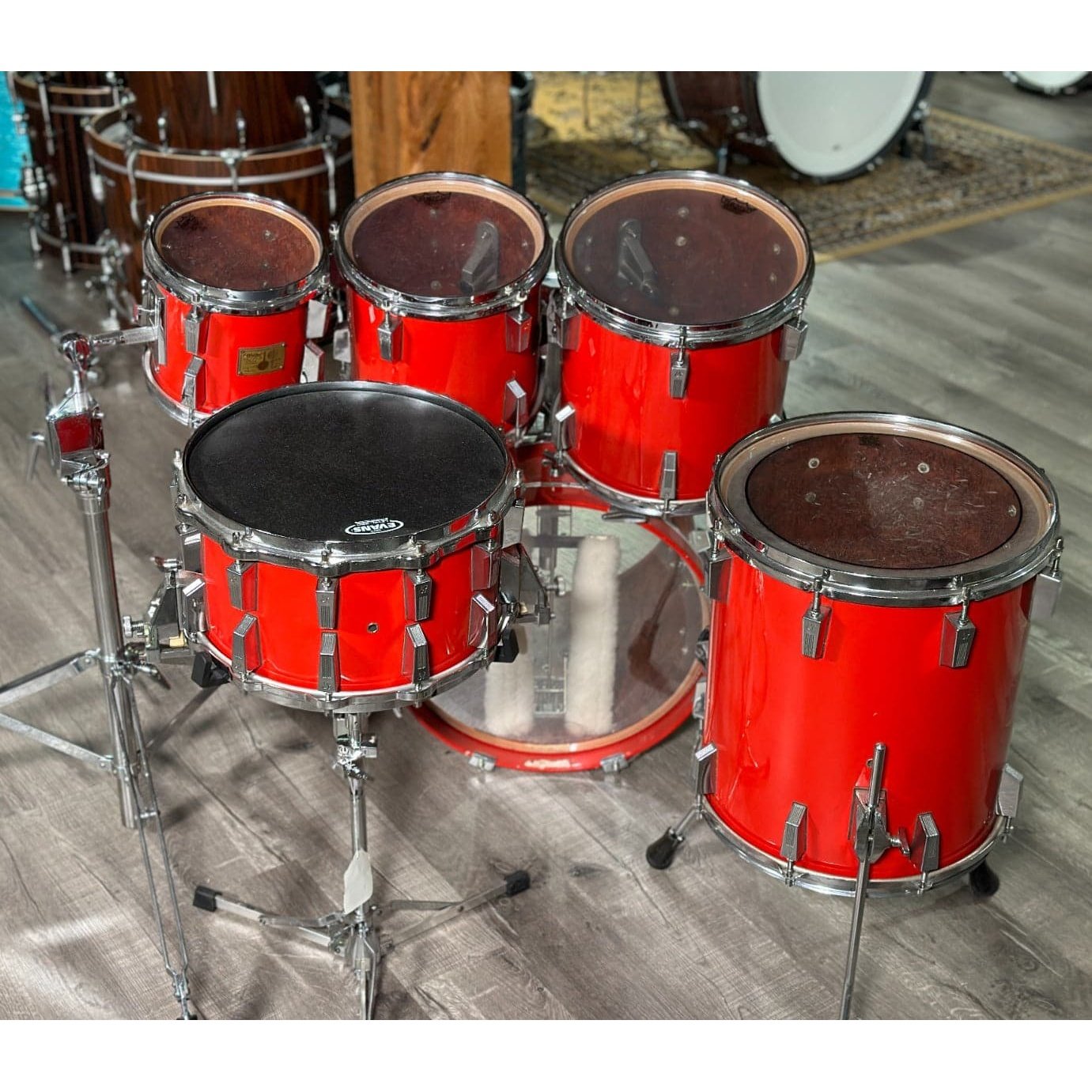 Talk about RARE! There are VERY few Tornado Red Signature sets out in the wild, especially in these sizes and condition! It's strange, this is the color made famous by Steve Smith in the 80's but you don't see a lot of them out there. Unquestionably the high water mark in drum building, the phrase "they don't build them like this any more" really holds true with the Signatures. 18x16 Bass drum, with square size 8/10/12 rack toms, a 14x16 floor tom, and a matching 14x8 snare drum!